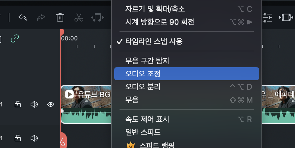 이후 동영상을 선택한 다음 마우스를 우클릭한 후 오디오 조정으로 들어갑니다.