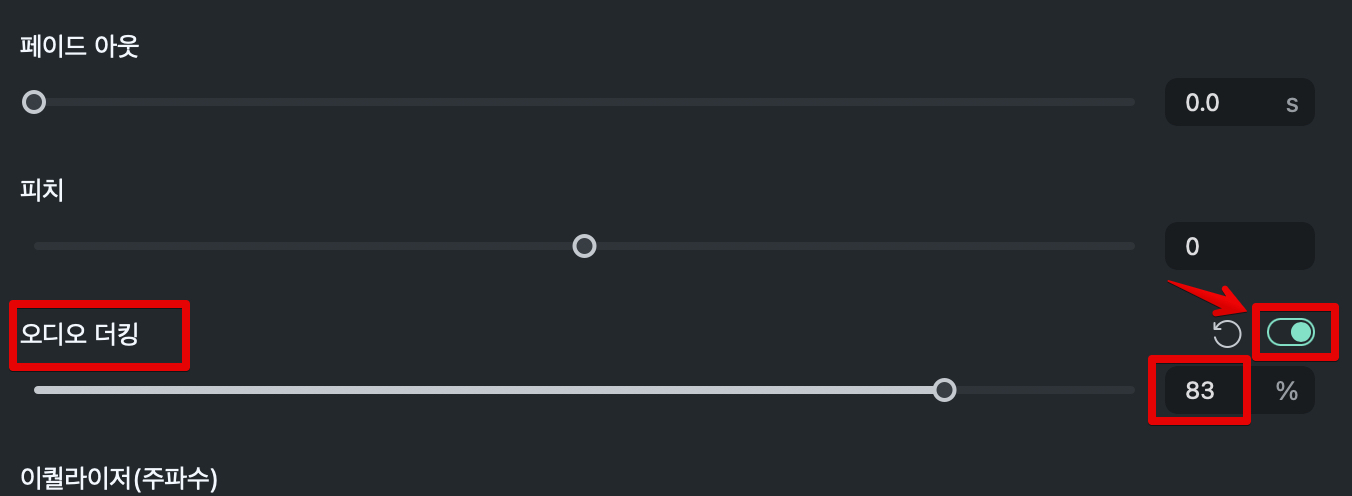 오디오 조정 메뉴가 나타나면, 오디오 더킹 항목을 찾은 다음 우측에 있는 활성화 버튼으로 오디오 더킹을 활성화를 해줍니다. 이때 %를 잘 결정해야하는데요. %는 영상의 오디오와 소리를 직접 들어보면서 적절한 수치로 맞춰주면 됩니다.