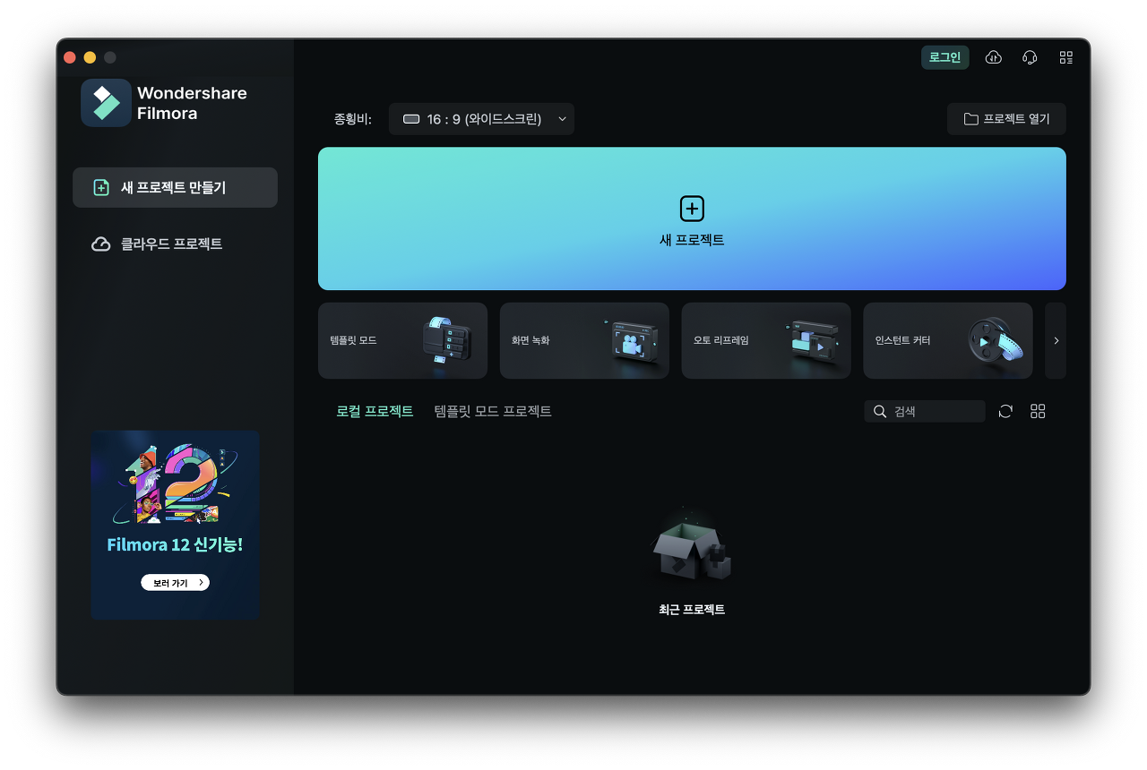 우선 프로젝트를 만들어야합니다. 필모라12를 실행한 후 새 프로젝트 버튼을 눌러서 프로젝트를 생성해줍니다.