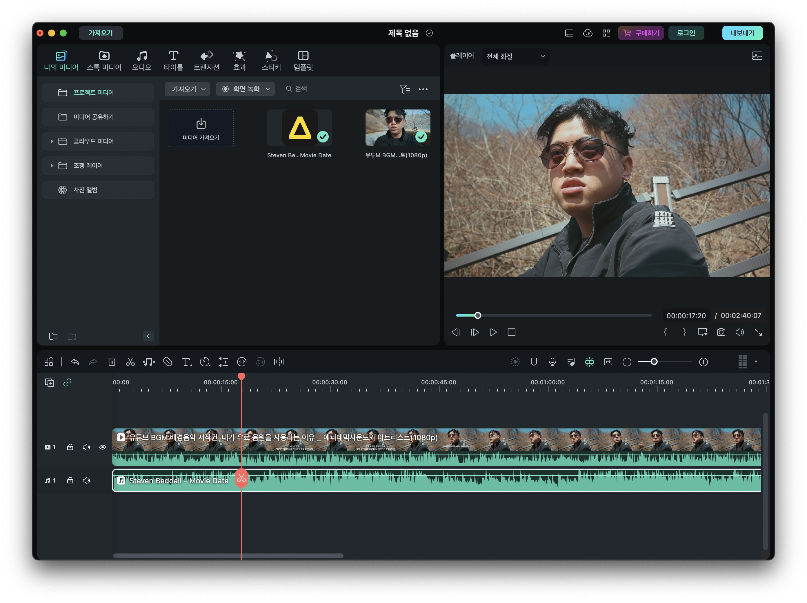 오디오 더킹이 완료되었습니다. 목소리가 있는 부분에서는 배경음악이 작게 들리며, 목소리가 없는 부분에서는 배경음악이 크게 들리는 자연스러운 영상 오디오 효과를 손쉽게 만들 수 있었네요. 조금 뚝 끊어지는 느낌이 든다면 페이드인과 페이드아웃을 추가할 수도 있겠습니다. 직접 하나하나 키프레임을 넣지 않고도 이렇게 쉽게 오디오 더킹을 만들 수 있는점이 필모라12의 장점입니다.