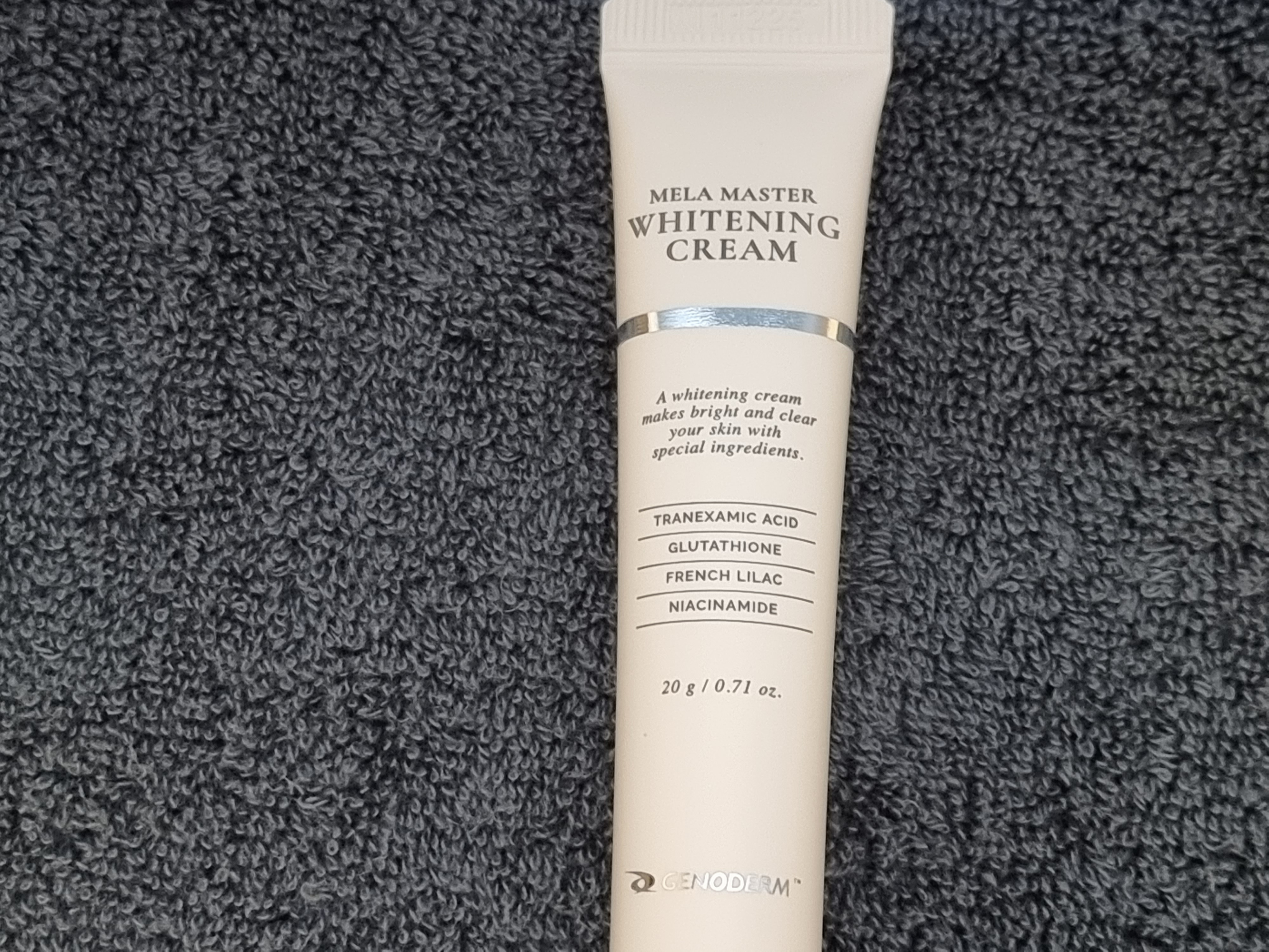 제가 받은 제품은 이 제품입니다. 이름이 제노덤 멜라 마스터 화이트닝 크림 이고요. 굉장히 얇고 작은 사이즈입니다. 20g이더라고요.