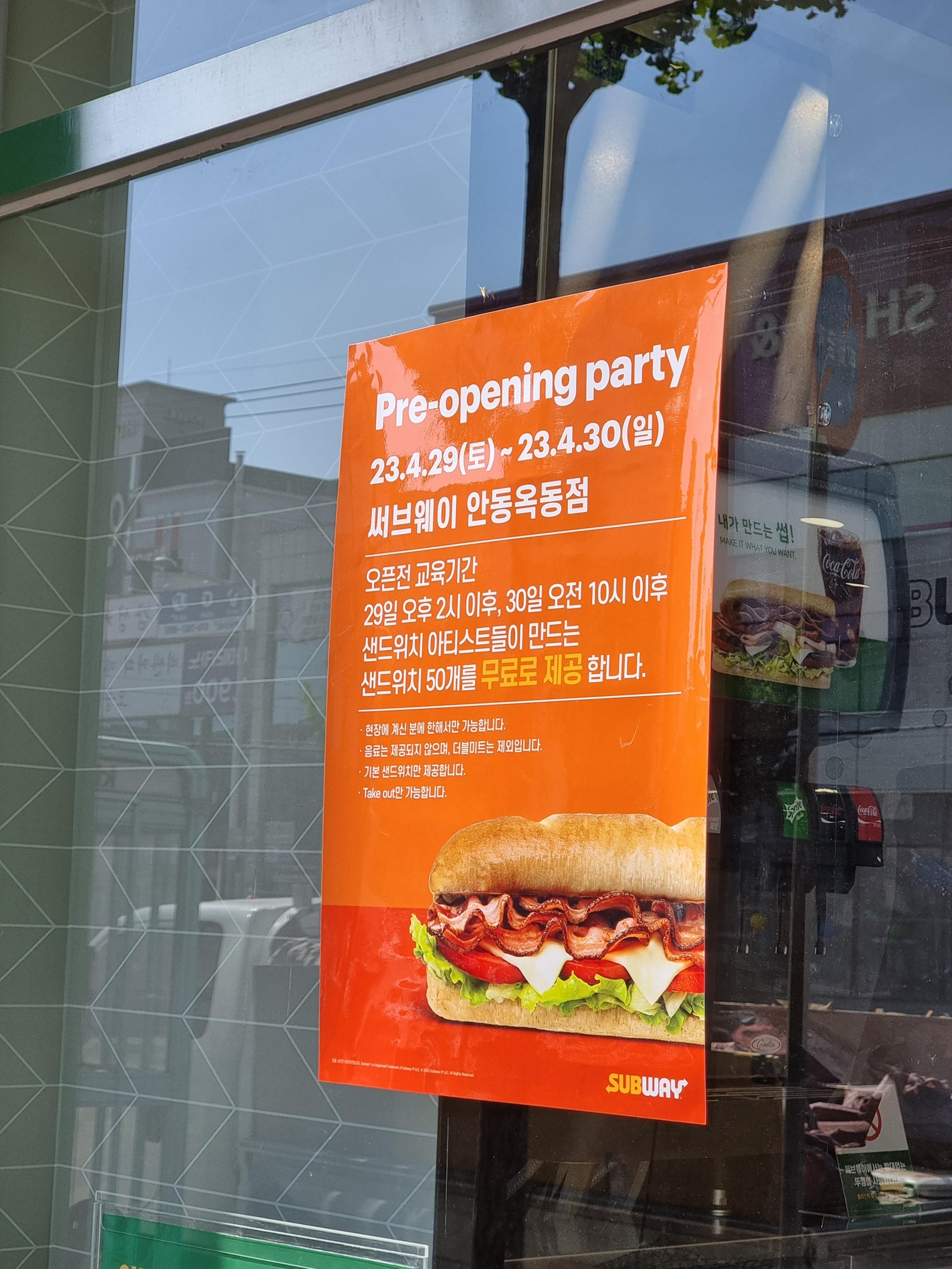 안동 옥동 서브웨이 프리오프닝파티는 4월 29일과 30일에만 진행하는 듯 합니다.
