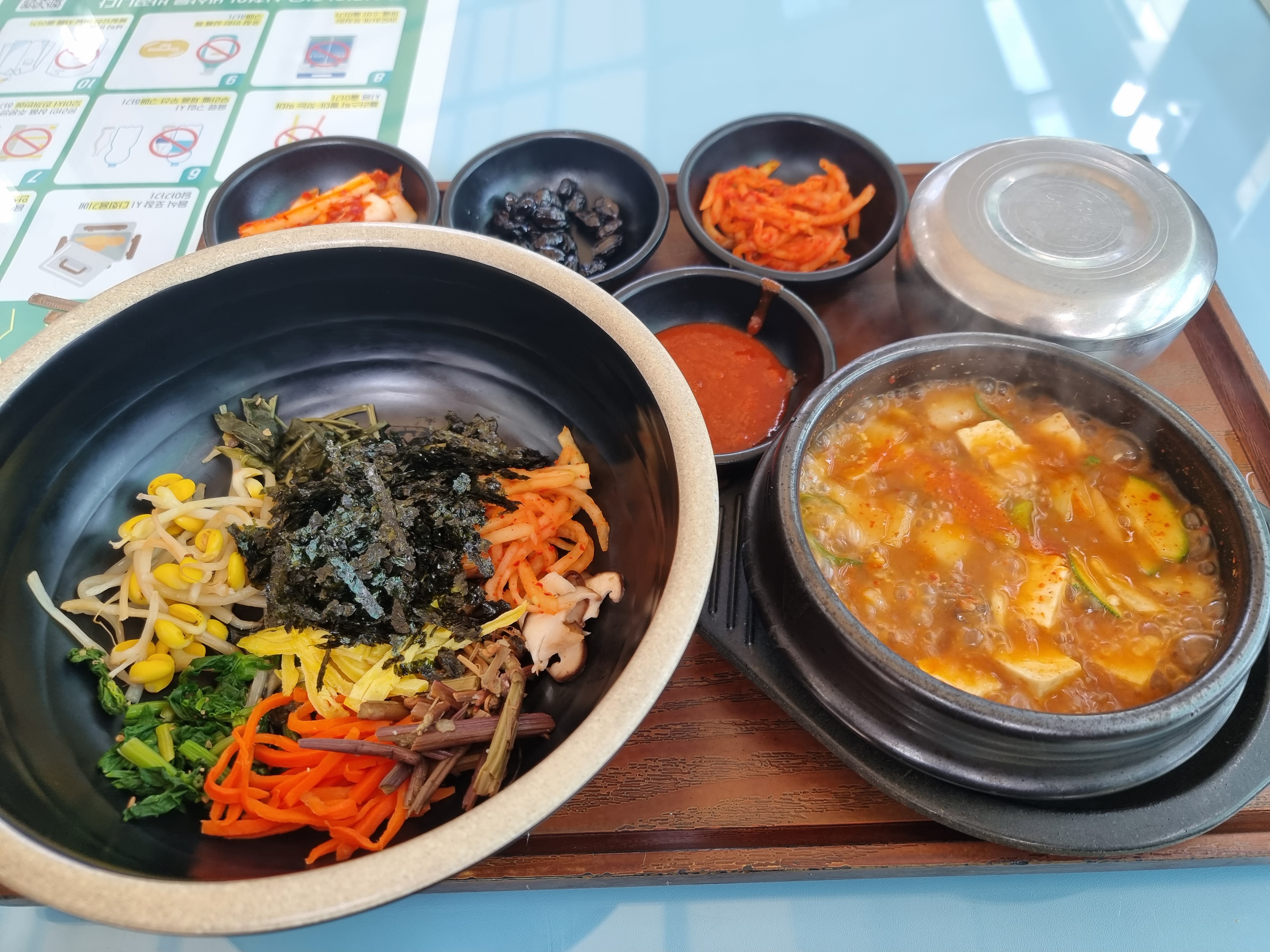 그런데 키오스크로 주문할 때의 그림에서는 된장찌개 그림이 없었어요. 그래서 찌개는 안주는줄 알았는데 건더기도 많이 들어있는 찌개가 팔팔 끓여져서 함께 나오더라고요! 굿이었네요 ㅎㅎ