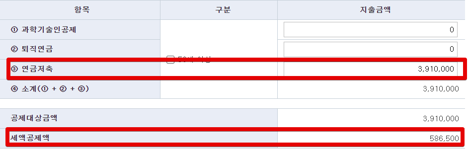그리고 종합소득세 신고 화면에서, 세액공제 화면에서 3번 항목인 연금저축 금액을 확인하고 아래쪽에 세액공제액을 체크합니다. 공제율이 얼마나 적용되는지 살펴보시면 되는데, 저의 경우 15%(3910000 * 15%)를 적용받았습니다. 이렇게 된 이유는 종합소득금액에서 소득공제를 넣어서 과세표준을 4천만원 이하로 맞추었기 때문입니다.