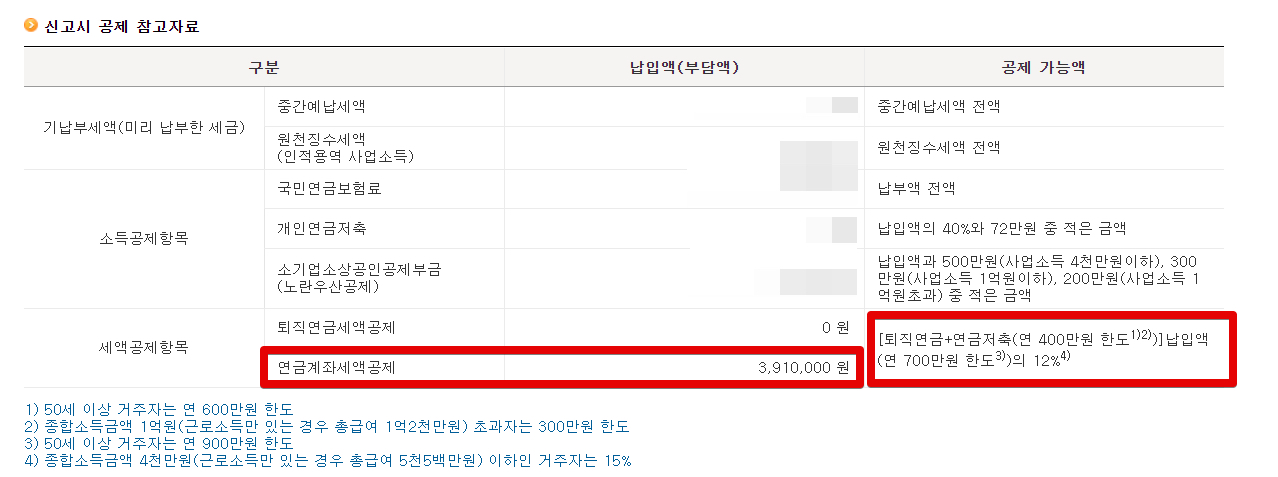 아무튼, 여기에서 연금계좌세액공제 금액과 세액공제되는 세액을 확인하시면 됩니다. 1년에 최대치로 60만원까지 세액공제를 받을 수 있습니다. 종합소득세의 경우, 케이스에 따라 다르겠지만, 세금이 많이 나오는 경우가 많기 때문에 이렇게 세액공제를 받을 수 있는 항목이 있으면 굉장히 유리합니다.