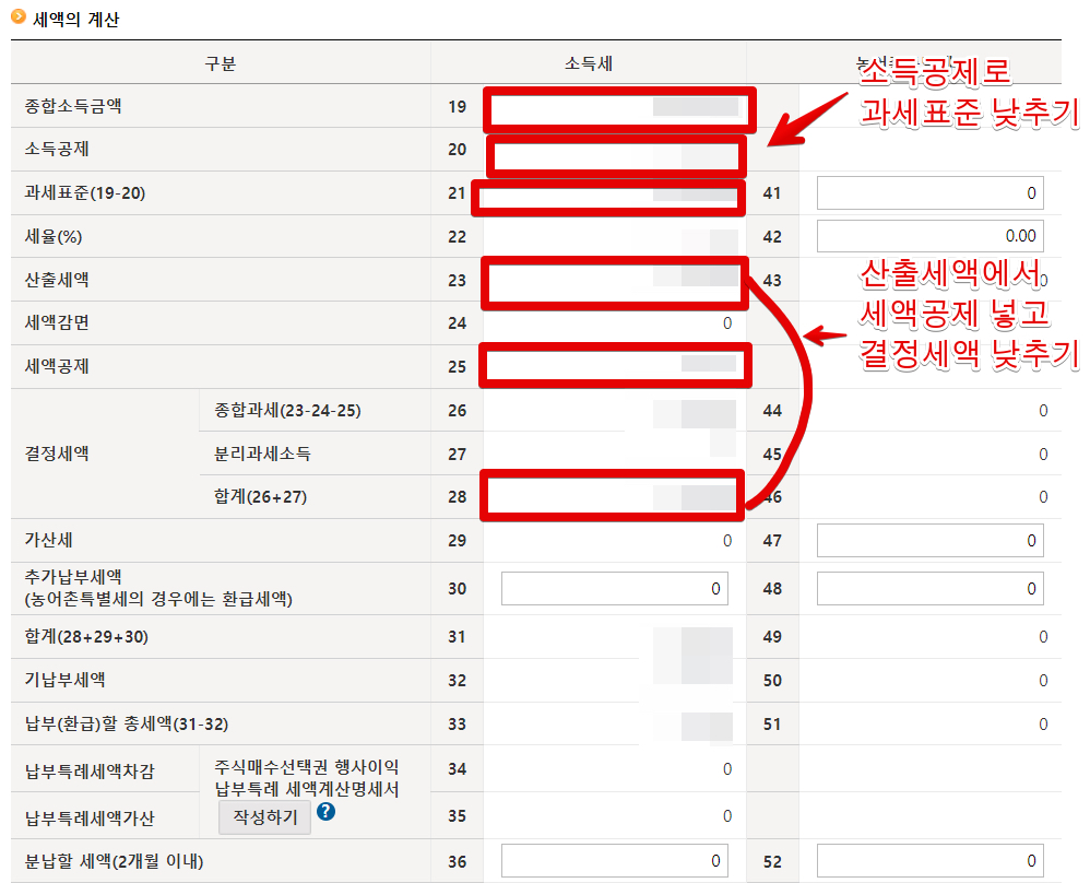 전체적인 흐름은 위와 같습니다. 종합소득금액에서 소득공제를 가능한 많이 추가하여 일단은 과세표준을 낮춥니다. 여기에 대한 산출세액이 나오게 되는데, 이때 개인연금저축계좌의 세액공제를 추가하여 세액공제 금액을 높여서 최종적으로 나오는 결정세액 금액을 낮추는게 핵심입니다.