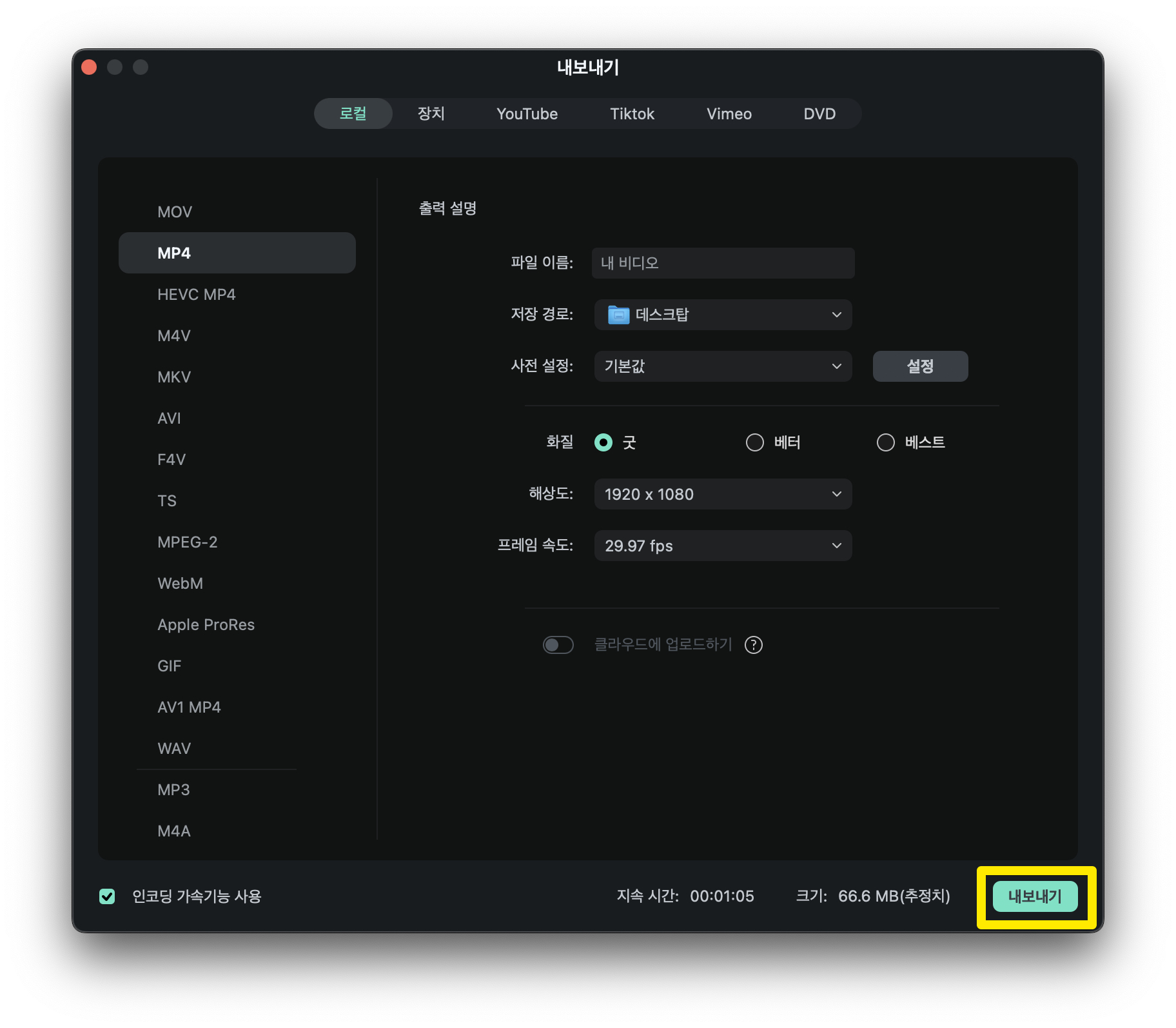 내보내기 버튼을 누른 후 왼쪽에서 코덱을 고를 수 있는데요. 여기에서는 MP4를 설정하시면 무난합니다. 많은 곳에서 사용되는 권장되는 코덱입니다. 그리고 출력 설명 항목에서 화질을 먼저 골라주는데요. 화질의 경우, 굿, 베터, 베스트가 있는데 용량을 줄이기 위해서라면, 굿을 설정하시면 되겠습니다.