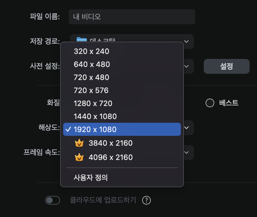그런 다음 해상도를 선택해줍니다. 해상도의 경우 커지면 커질수록 고화질이 되며, 작으면 작을수록 저화질이 됩니다. 최소 320*240 부터 그 이상으로 올려가면서 저장을 할 수 있도록 해주고 있는데요. 여기에서는 보통 1920*1080 사이즈(1080p)로 설정하시면 무난하며, 유튜브에서 흔히 볼 수 있는 해상도가 됩니다.