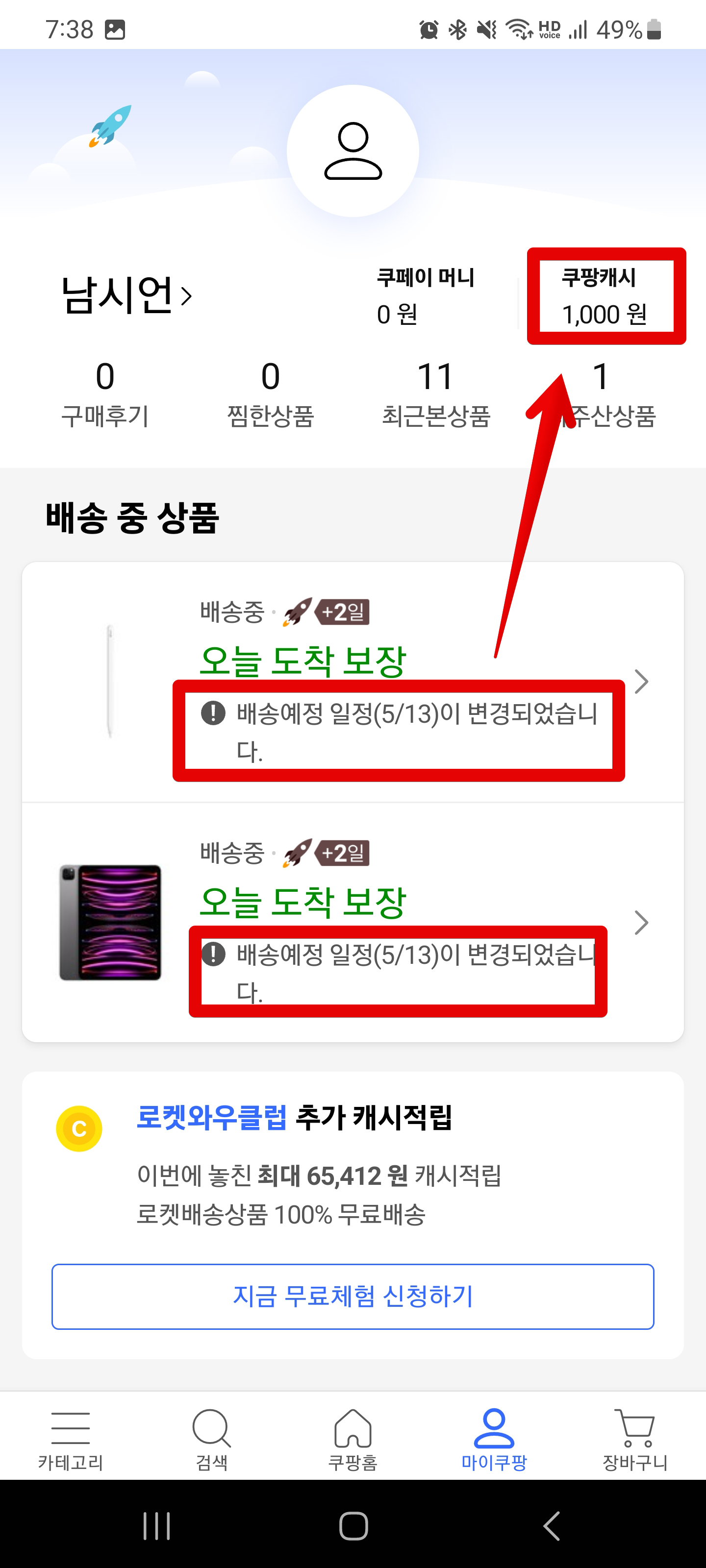 쿠팡 도착보장 로켓배송 배송지연 되어서 보상받음
