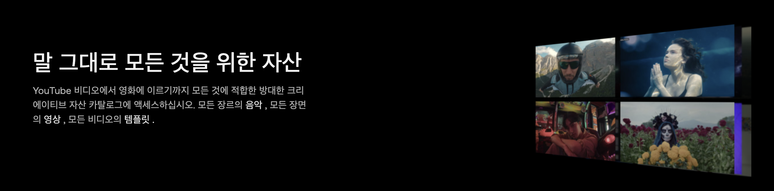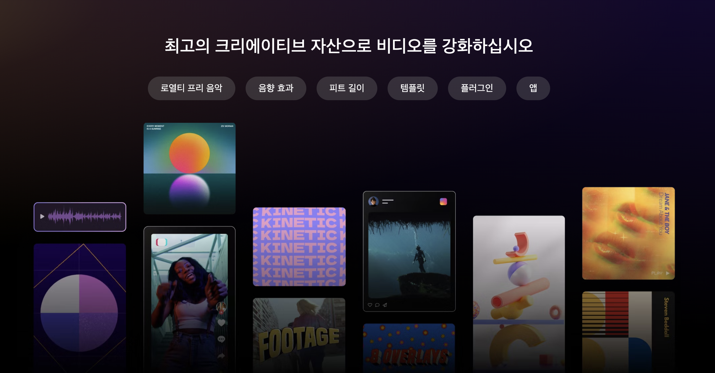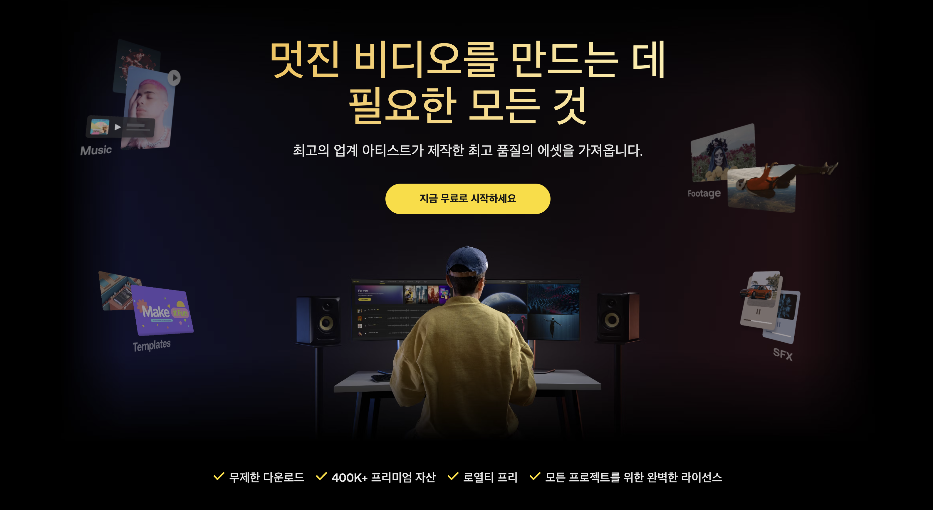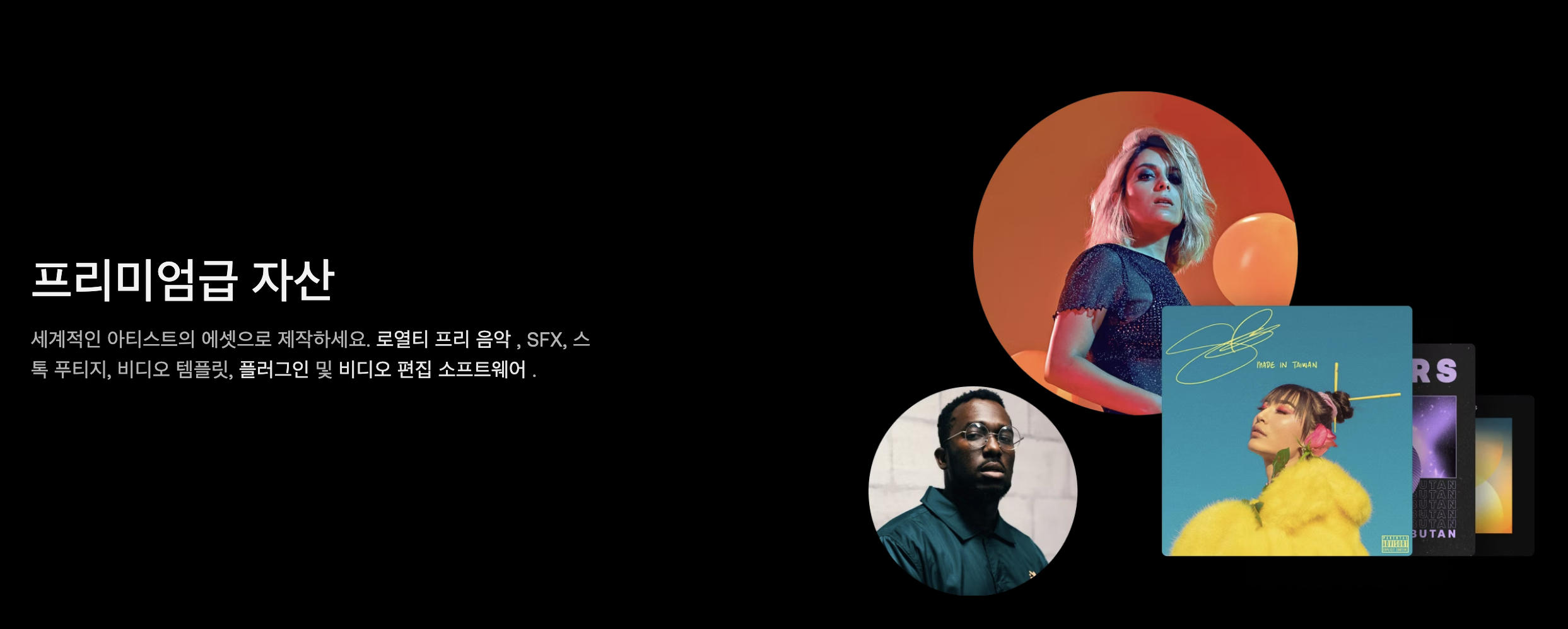 아트리스트에서 다양한 디지털 자산에 접근할 수 있습니다. 대표적으로 음악과 효과음, 스톡푸티지가 있으녀 이외에도 템플릿이나 플러그인, 비디오 편집 소프트웨어(히트필름)을 제공합니다.(Artlist MAX일 경우)