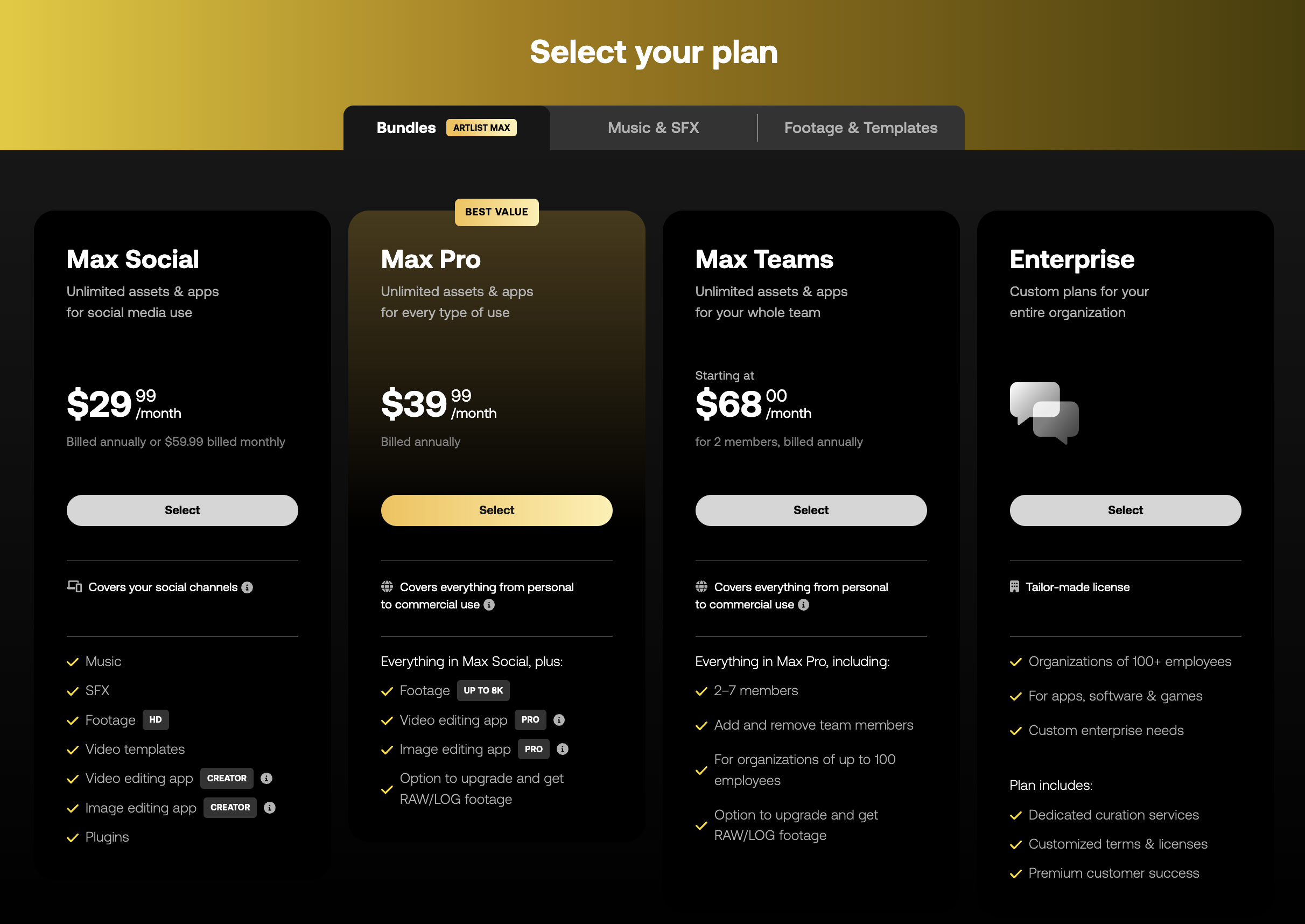 가장 먼저 아트리스트 맥스 플랜입니다. 여기에서는 맥스 소셜, 맥스 프로 등이 있으며 특별한 케이스가 아니라면, 보통은 맥스 소셜과 맥스 프로 중 하나를 고르면 됩니다.