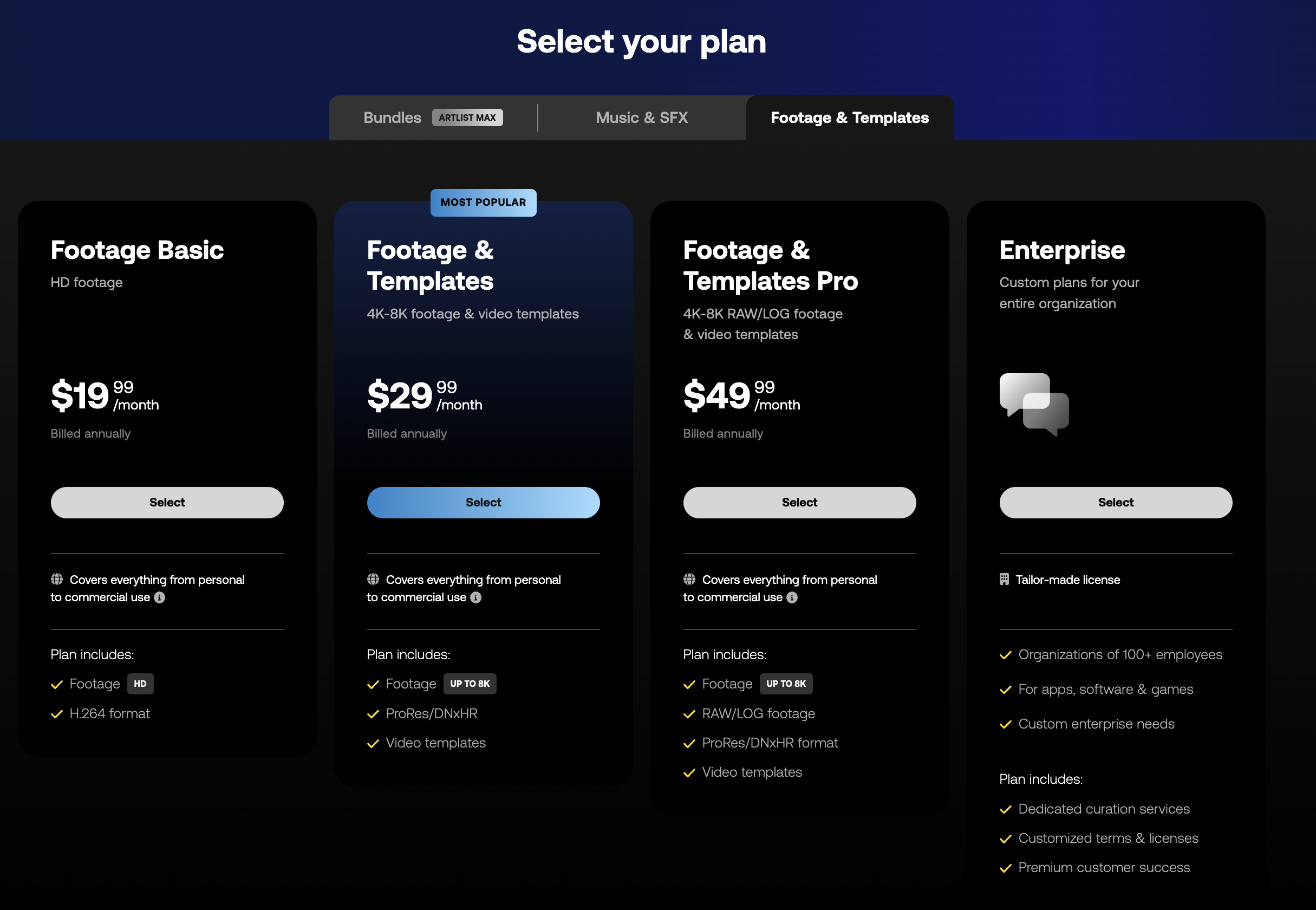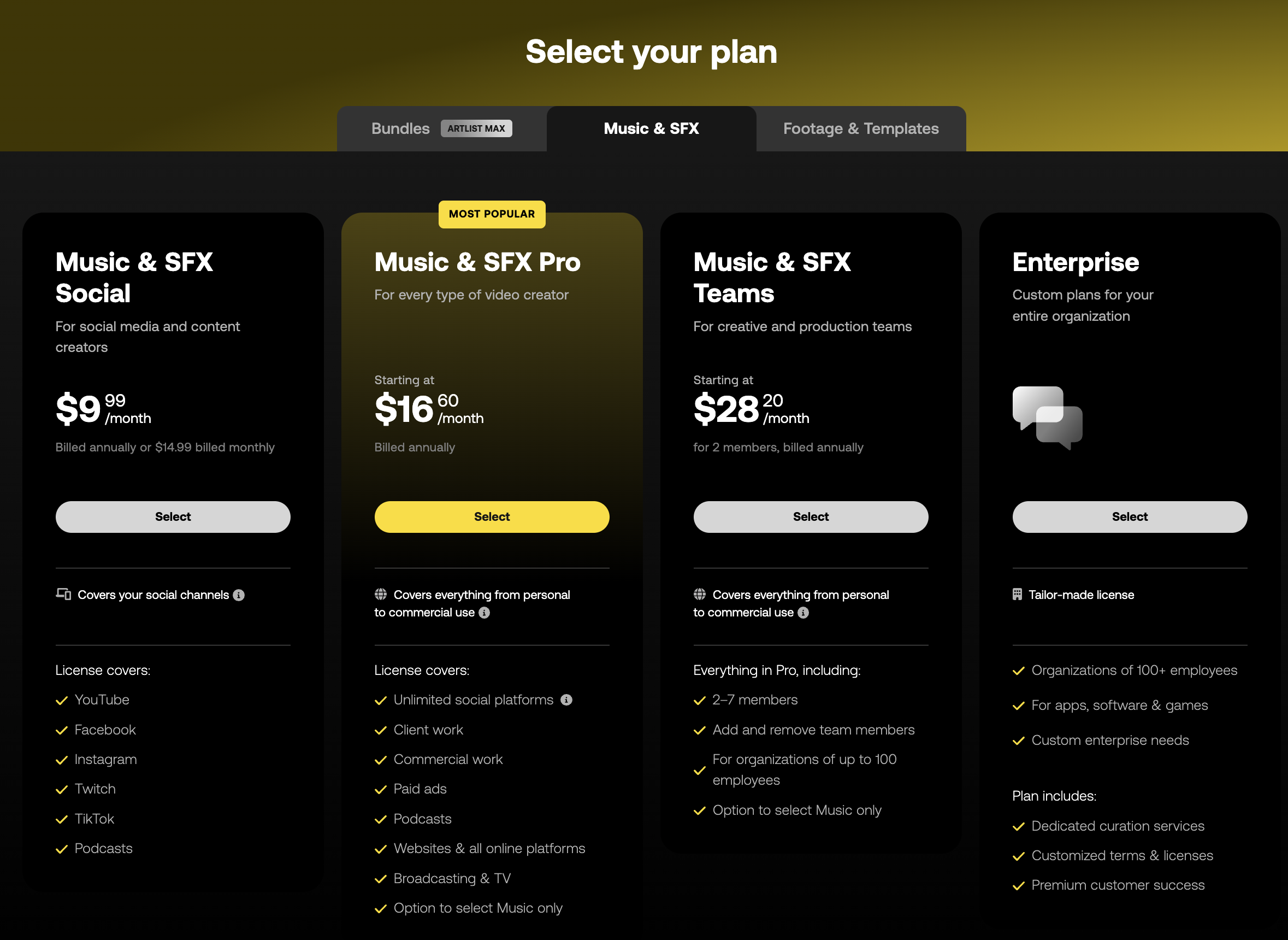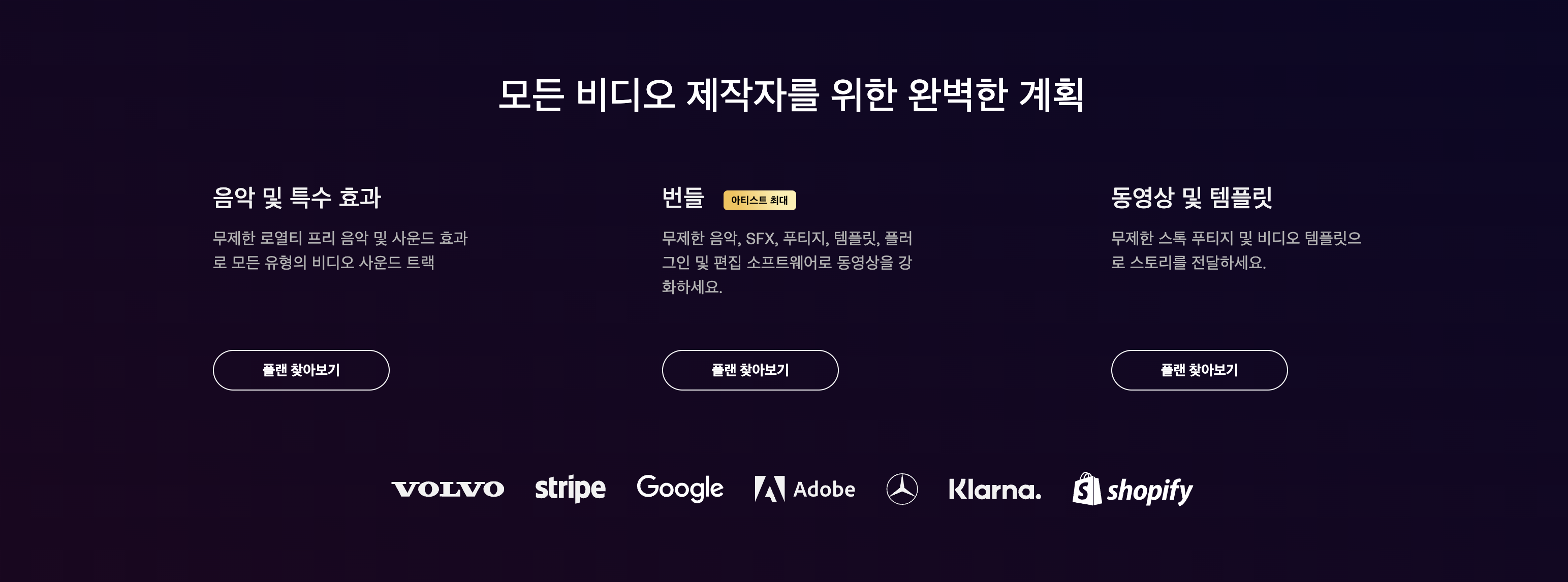- 음악과 효과음을 위해 월 $9.99부터 시작하는 저렴한 서비스 플랜(연간 플랜도 있음)