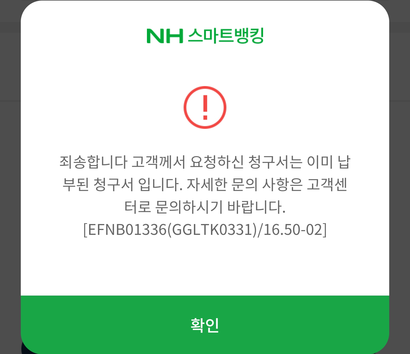 납부가 이미 완료된 상태에서 NH뱅킹 앱으로 이체를 시도하게 되면