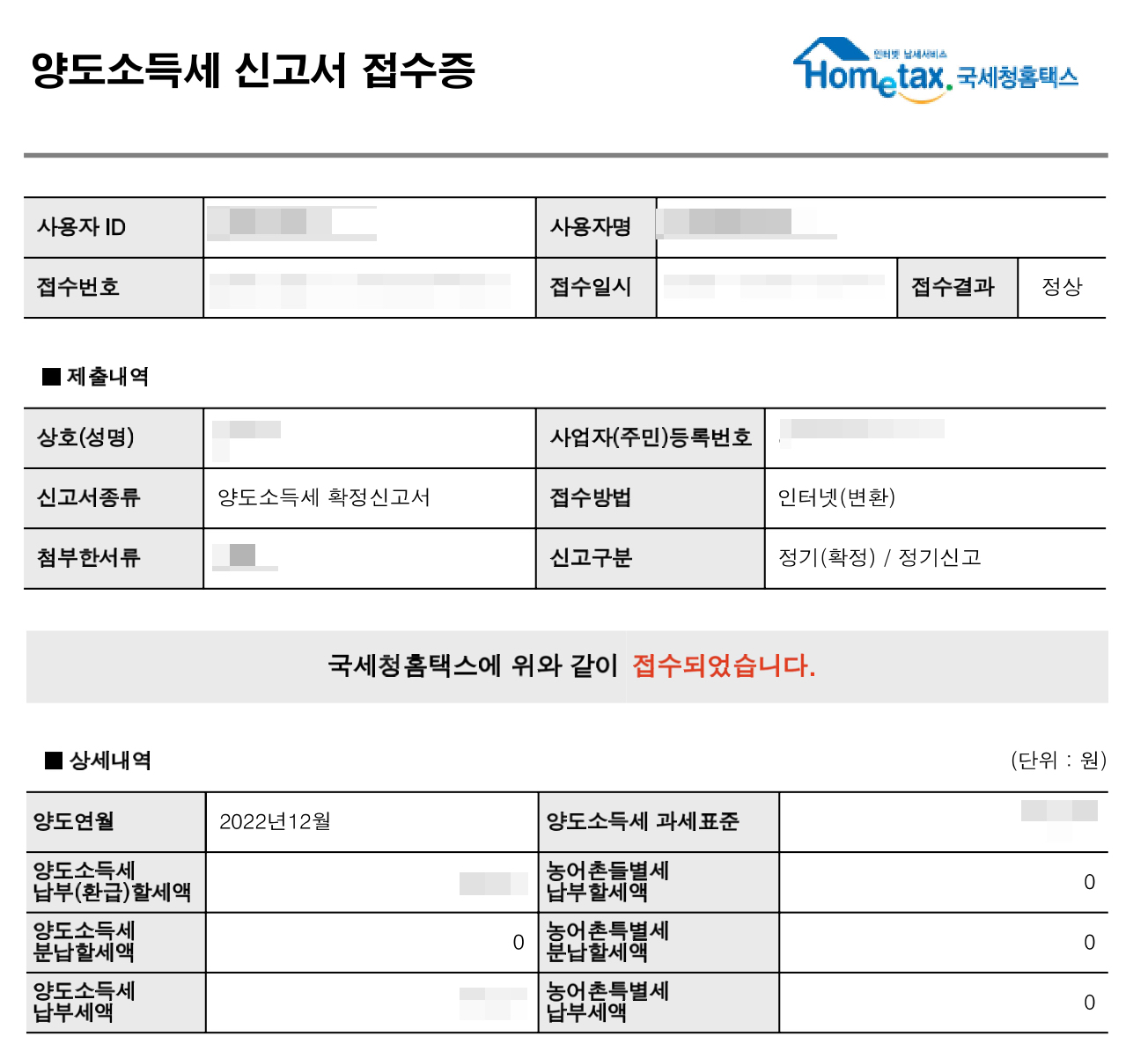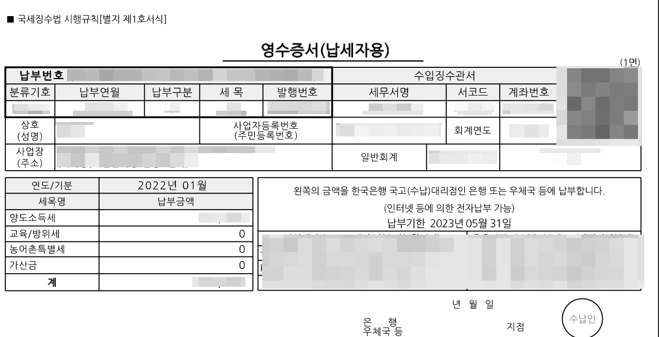 저는 총 3장을 받았는데요. 양도소득세 신고서 접수증, 국세 납부서, 지방세 납부서 이렇게 3장을 받았습니다.