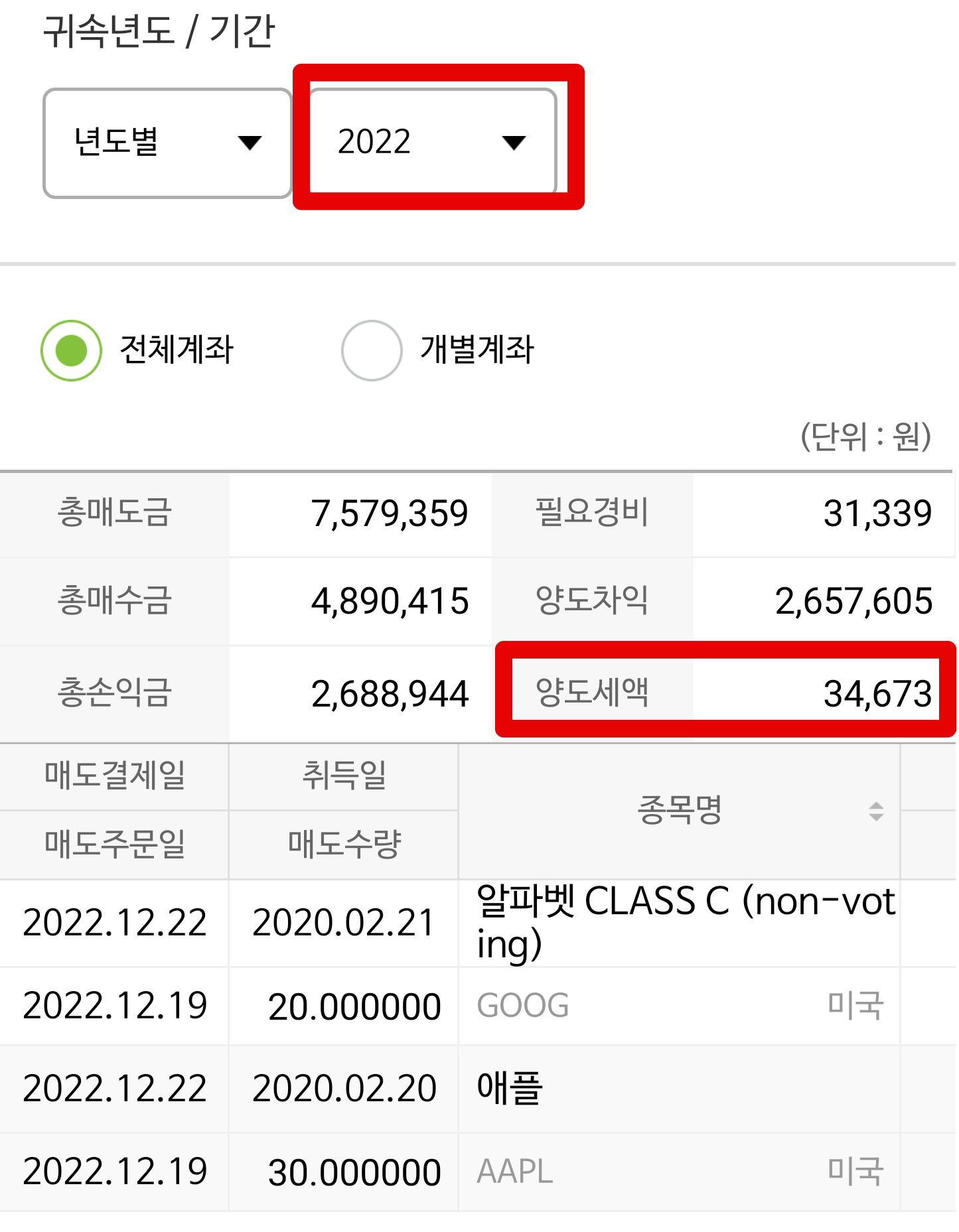 저같은 경우 작년 연말에 양도세 비과세 금액인 한도 250만원을 맞추려고 알파벳 구글 주식과 애플 주식 일부를 매도하였었는데요. 여기에서 손익금이 2,688,944원이 나왔으며 여기에 필요경비 31,339원을 빼고 양도차익으로 2,657,605원이 되었습니다.
