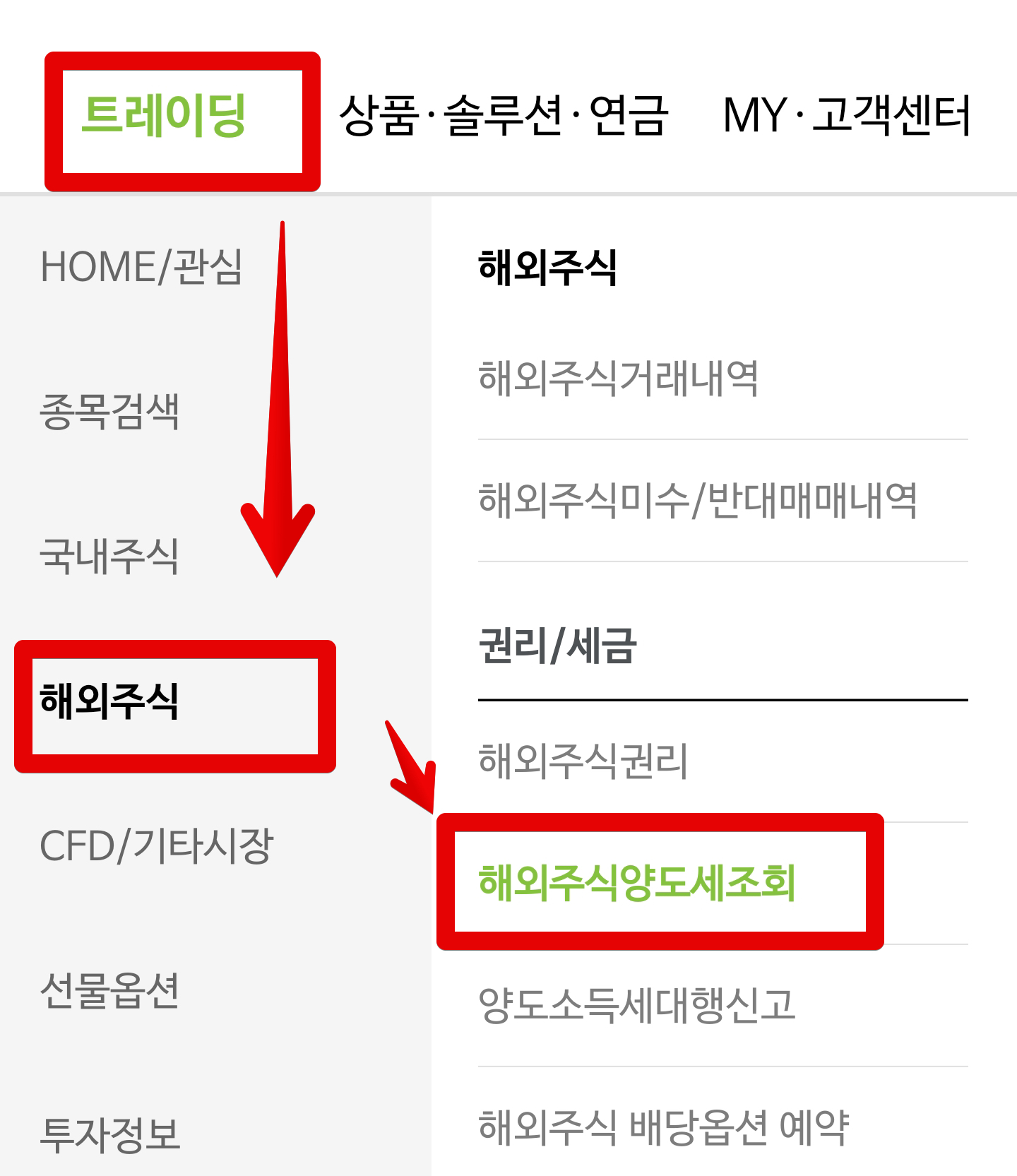 제일 먼저 NH투자증권 NH나무 앱으로 들어가시고요. 그 다음에 메뉴에서 [트레이딩]에서 [해외주식]으로 들어간 다음에 [해외주식양도세조회]를 클릭합니다.