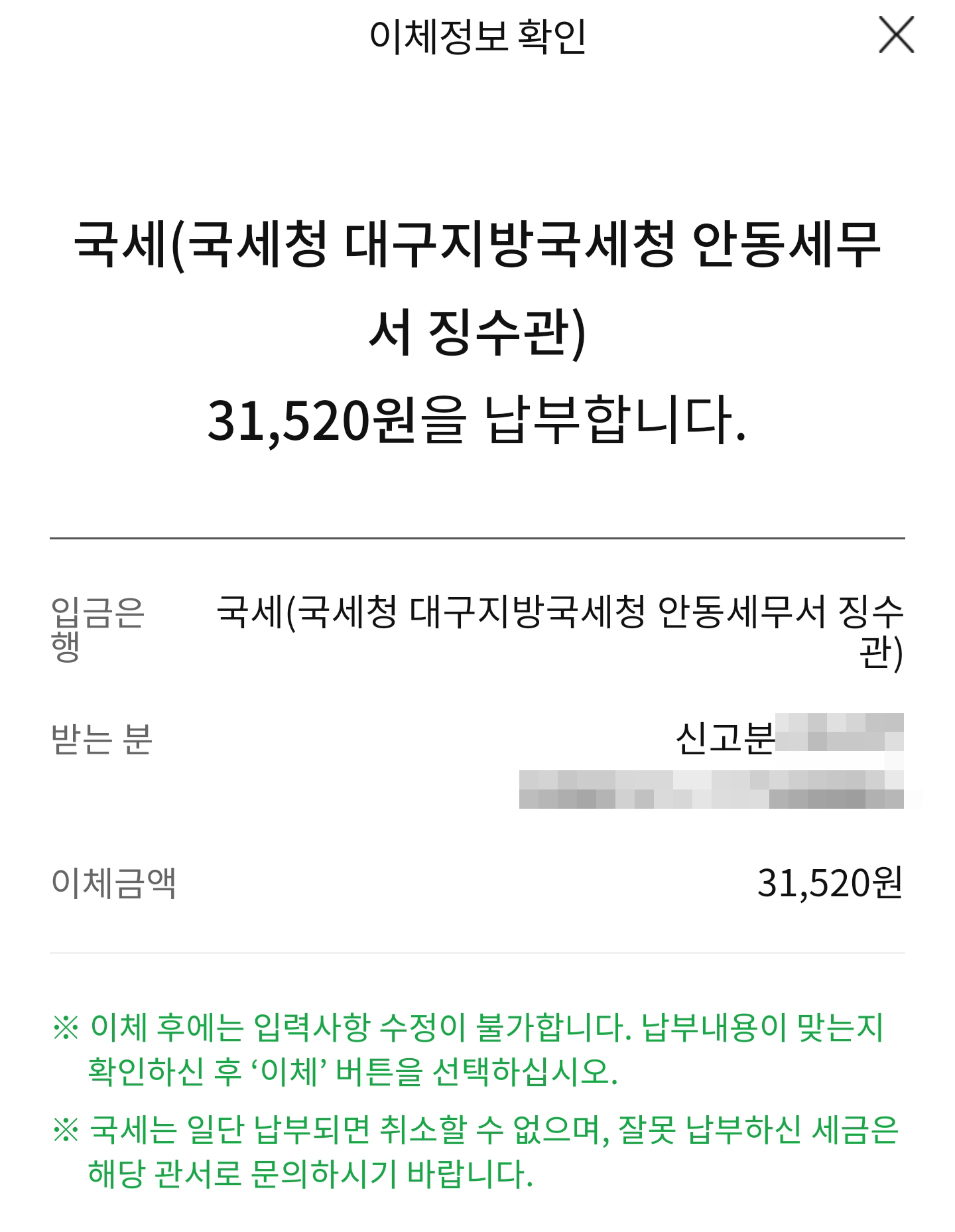 그런 다음 이체금액 꼭 확인하시고요. 입금은행도 납부서에 나와있는 징수관이 맞는지 체크하시고 이체하시면 끝납니다.