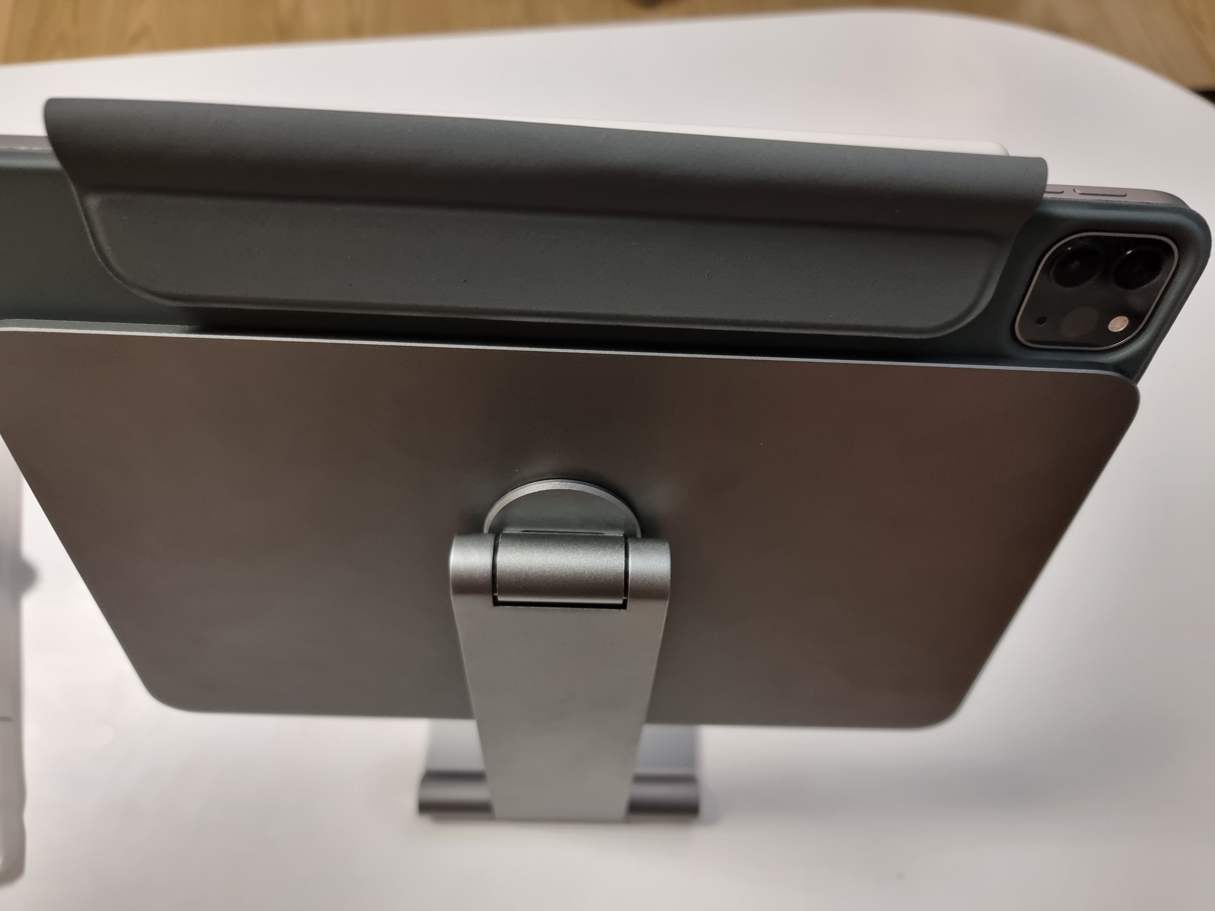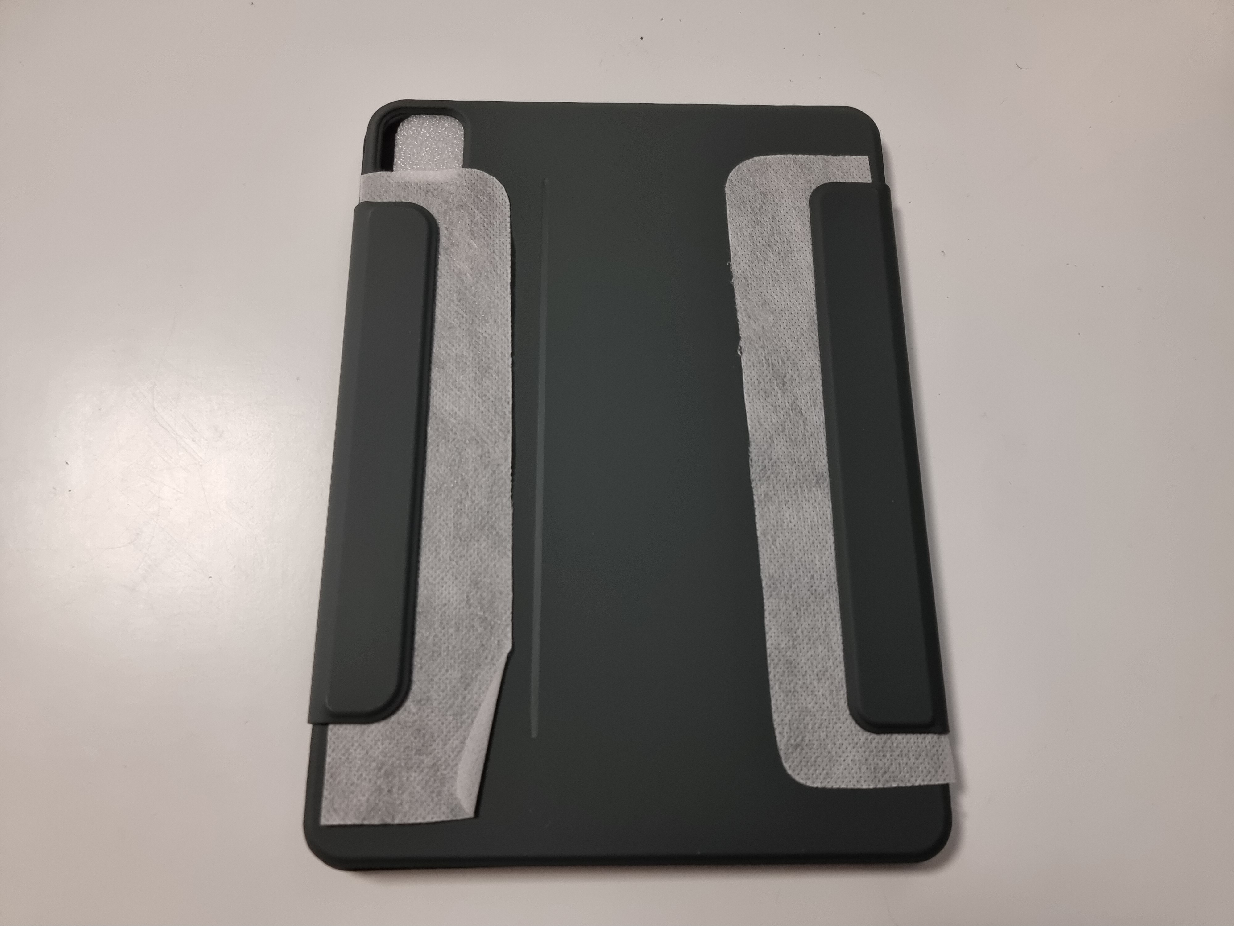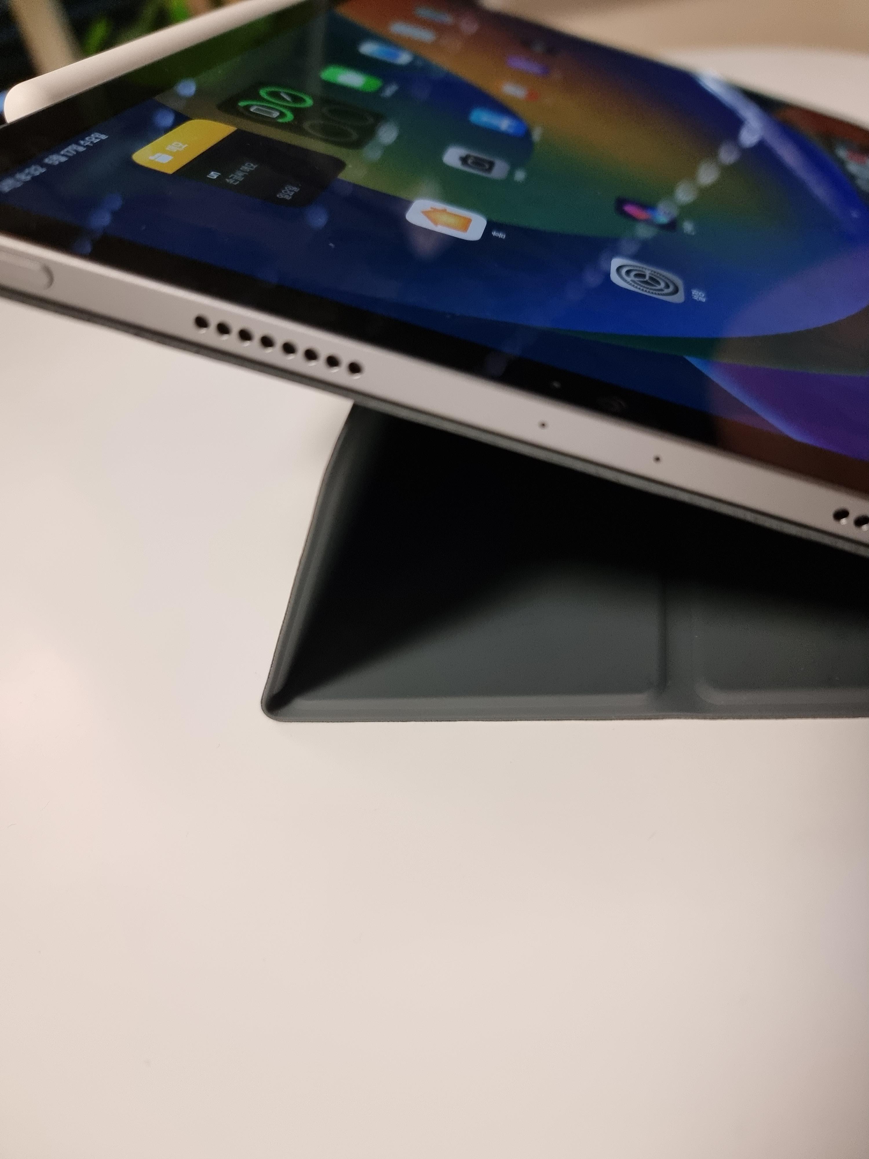 전체적으로 딱~ 달라붙어있는 느낌은 좋고요. 뒷판의 경우에는 케이스를 착용한 상태에서도 거치대에 거치가 가능해서 더욱 좋았습니다. 자성은 무난한 수준이라서 케이스만 잡고 아이패드를 들면 떨어질 수도 있을 정도인데 뗐다 붙였다 하는걸 좋아하는 저로서는 이런 방식이 더 잘 맞았습니다.