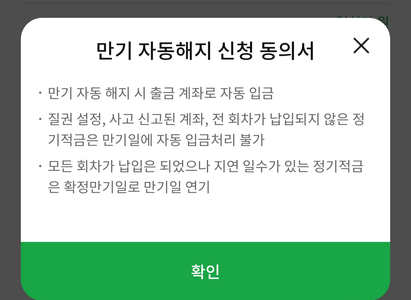 - 만기해지는 자동해지를 신청해두게되면, 만기날 다음날 해지된다. (새벽시간에 해지되어 입금됨)