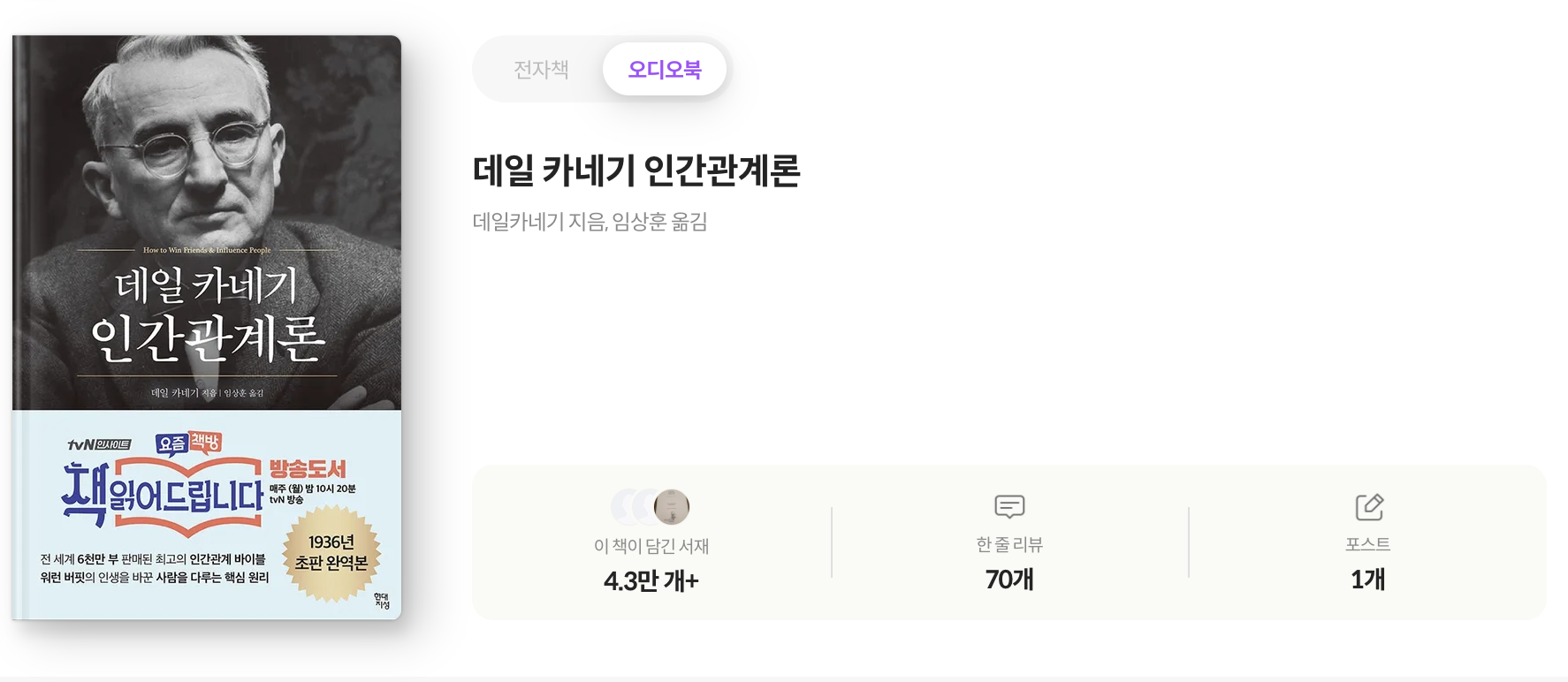 밀리의서재 오디오북에서 데일카네기 인간관계론을 다시 청취하고 있습니다. 오디오북은 읽는다고 표현해야할지... 아니면 청취하고 있다고 해야할지 조금 애매하긴한데요. 아무튼 오디오북으로 들으면 멀티태스킹이나 흘러가는 시간에 독서를 할 수 있어서 하루를 알차게 보낼 수 있는 듯 합니다. 예를들어 저는 KTX나 고속버스를 타고 다른 지역으로 출장을 갈 때 오디오북을 듣거나 집안일을 하거나 샤워할 때에도 오디오북을 종종 듣는데 짜투리 시간이라고 하더라도 조금씩 쌓이면 그 차이가 크더라고요.
