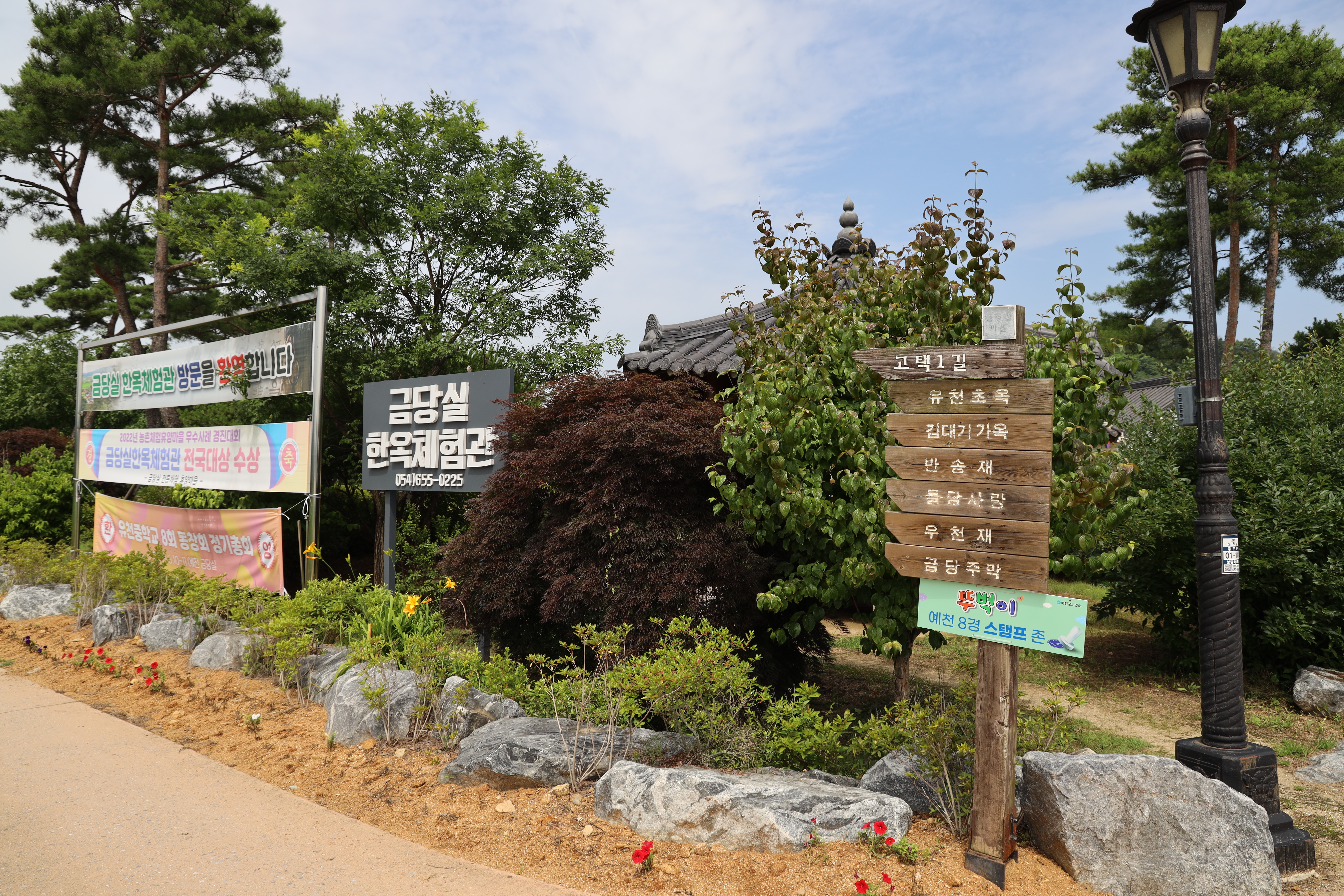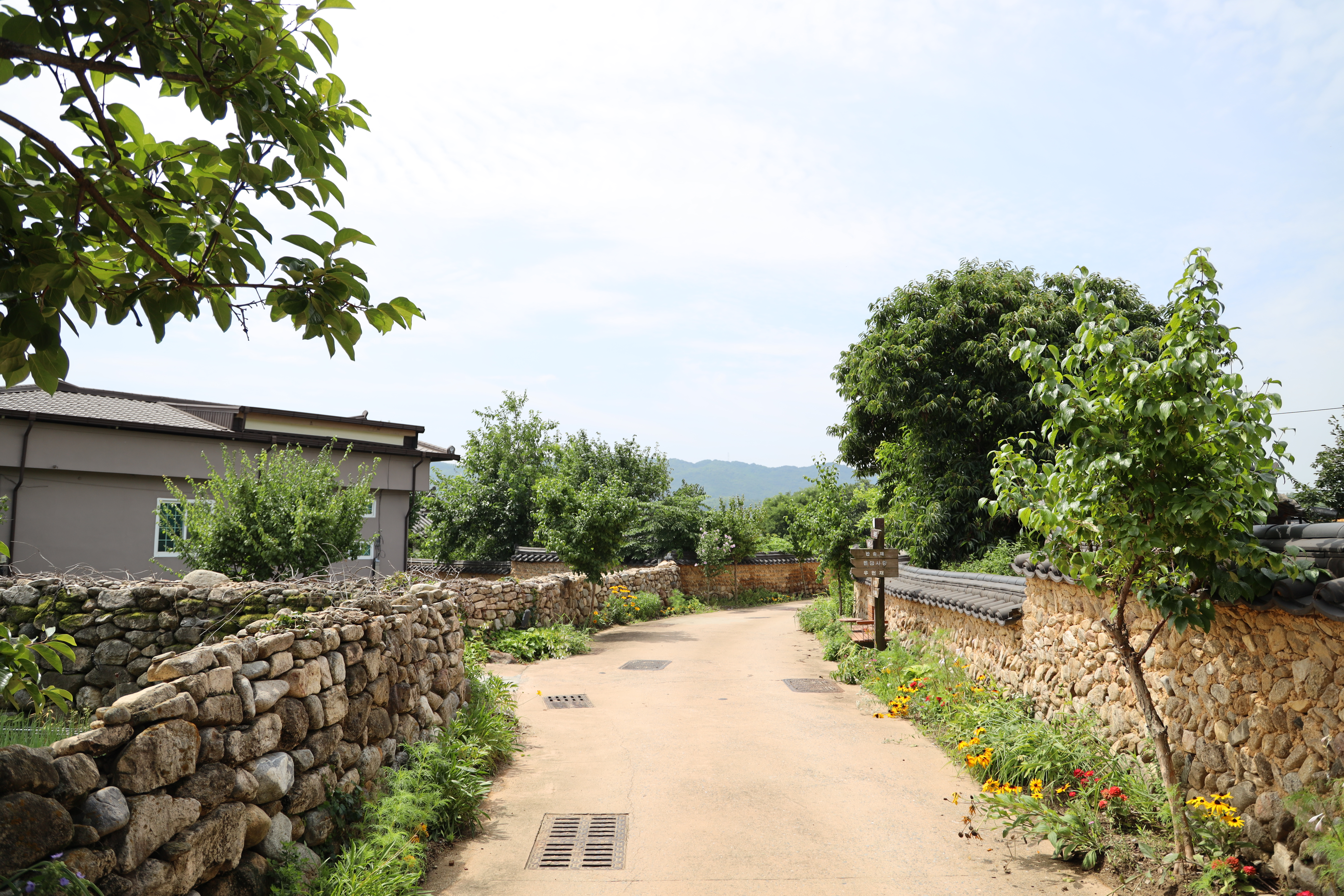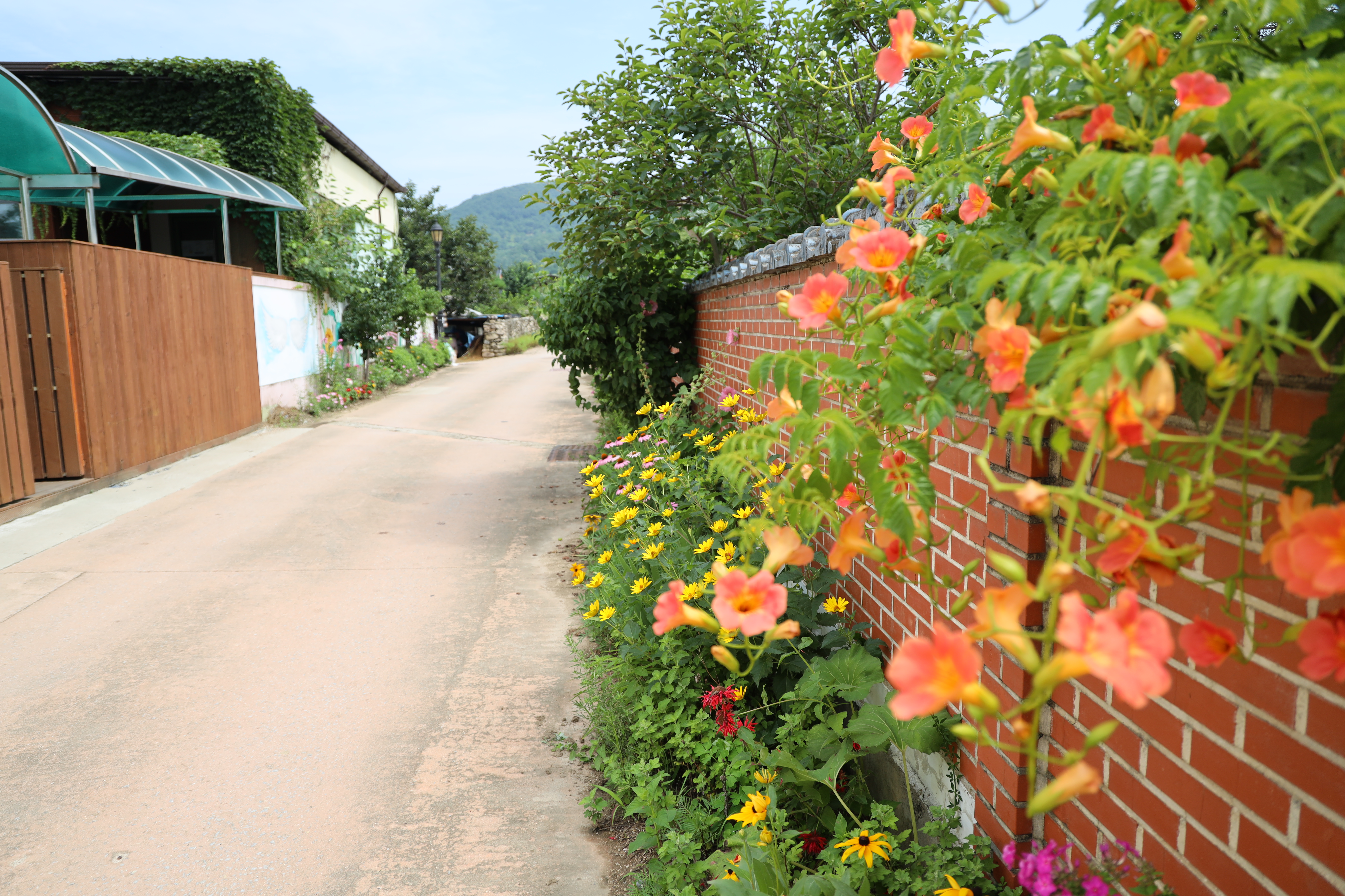처음 주차장에 주차를 한 후 도보로 조금 이동을 하여야합니다. 금당실전통마을의 뚜벅이챌린지 스탬프 적립을 하는 곳은 한옥체험관 앞이더라고요. 그래서 평소 제가 자주 가던 길이 아닌 한옥체험관쪽으로 걸어가보았습니다. 가는 길에 금당실전통마을 길 양옆으로 예쁜 꽃들이 식재돼 있어서 즐거운 도보 여행... 말 그대로 뚜벅이 여행이었네요!