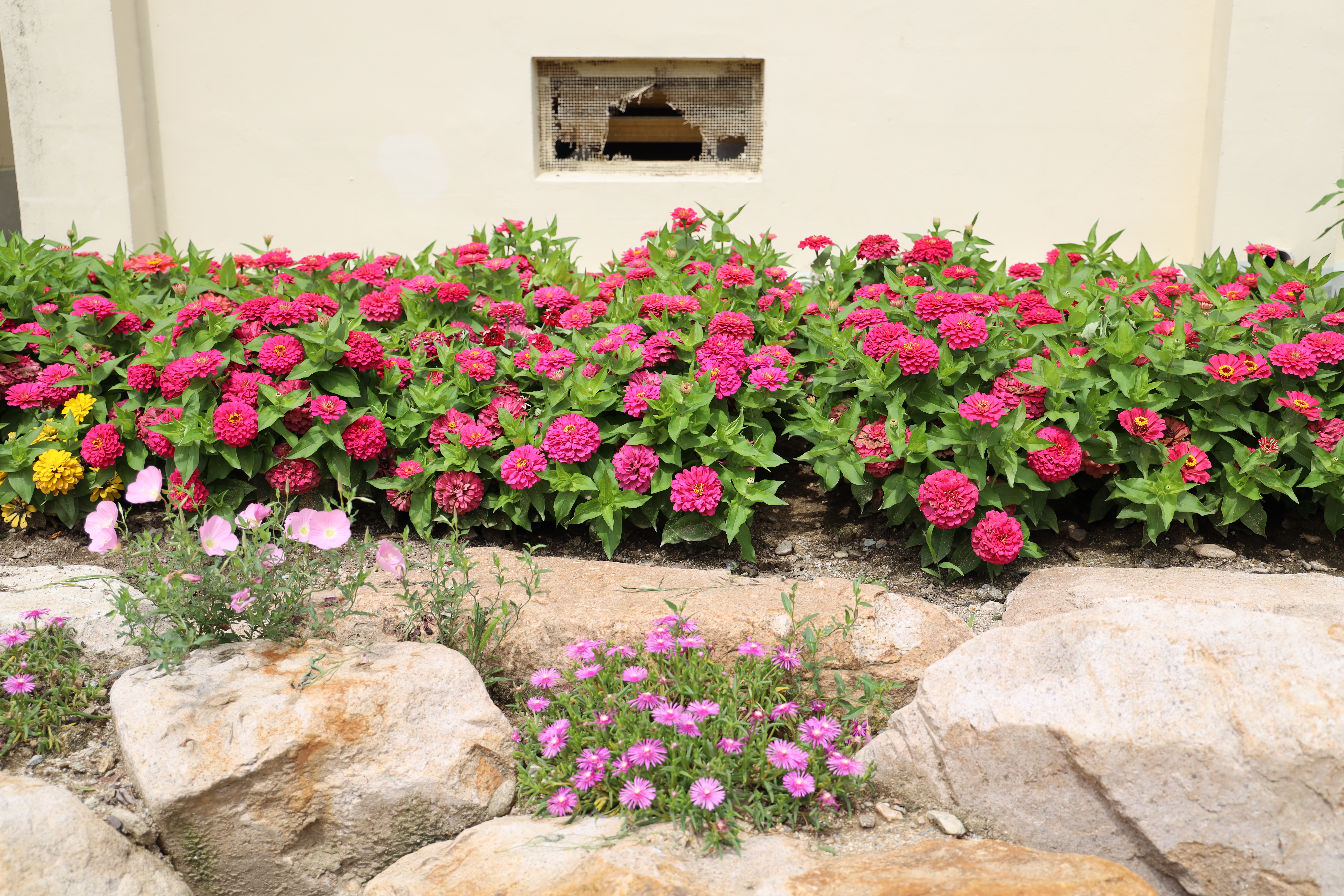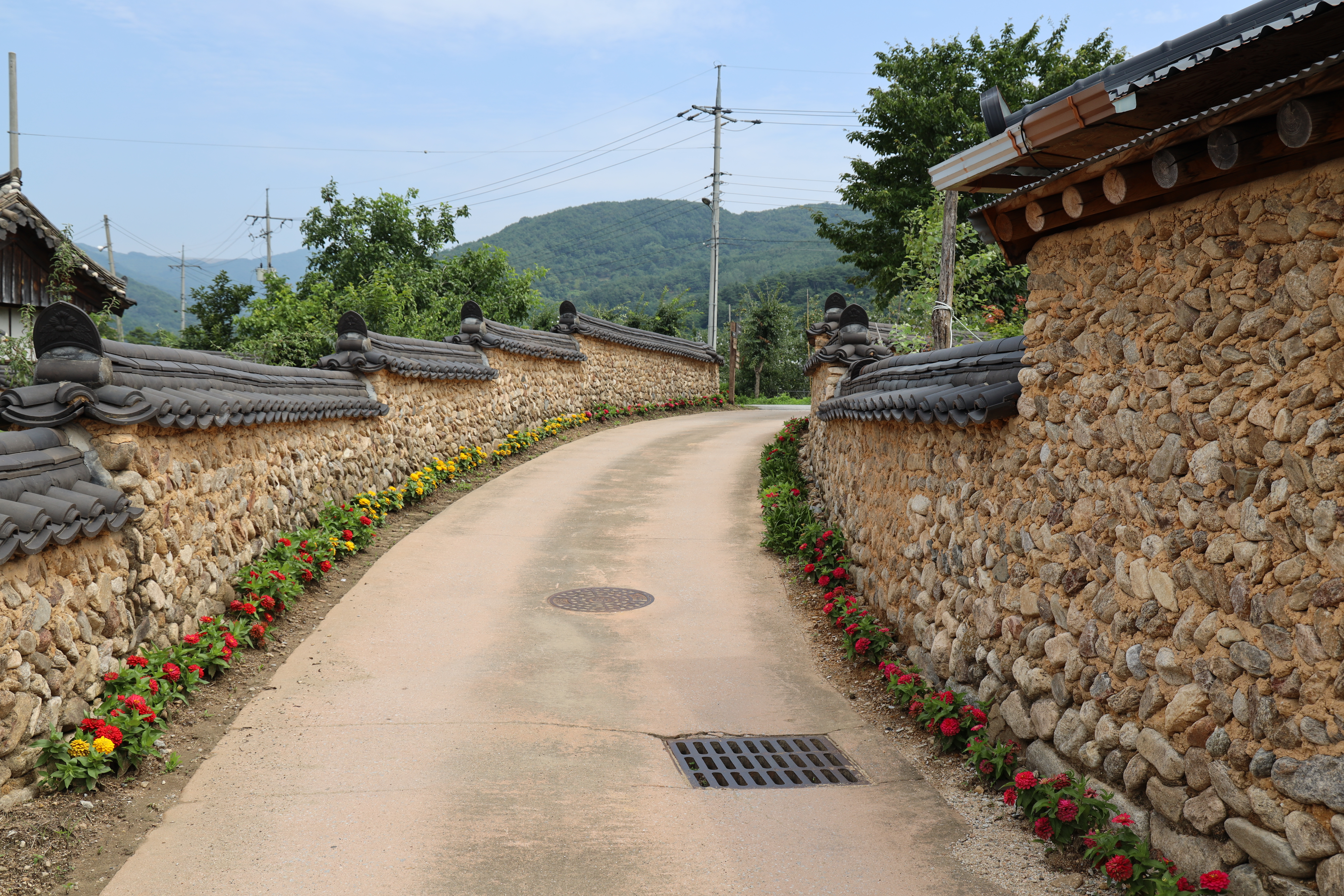한옥체험관으로 향하는 길 중간쯤 어딘가의 모습입니다. 돌담벽과 길 아래에 주르륵 딸린 꽃들... 예쁘죠?