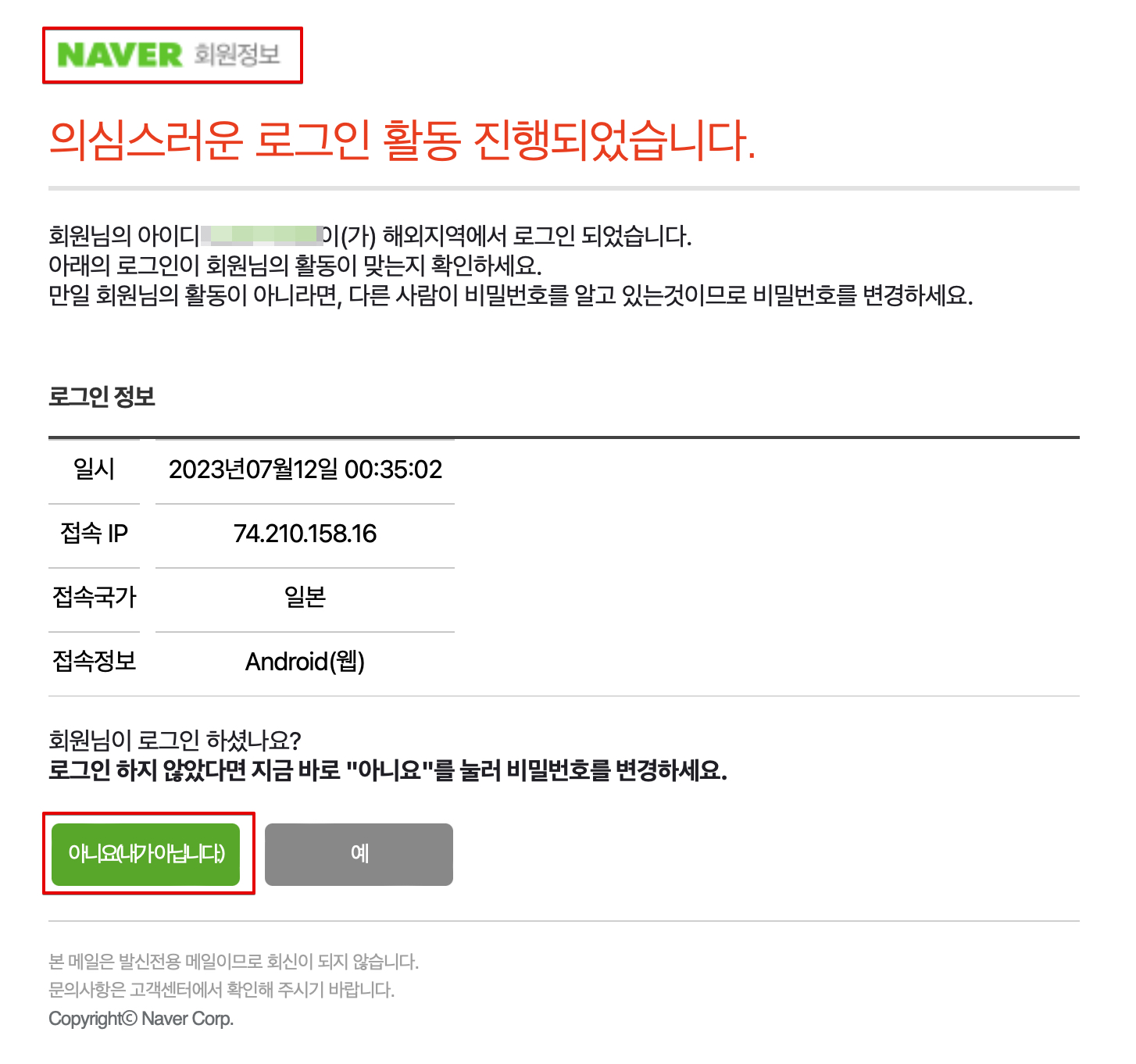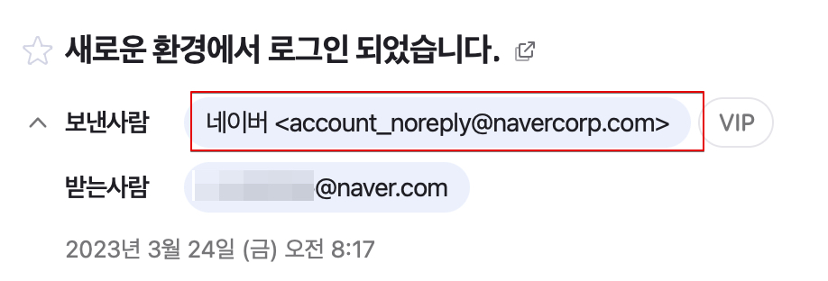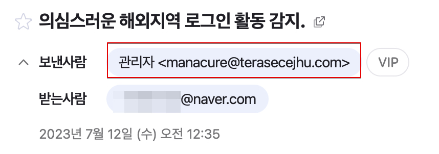 네이버 "의심스러운 해외지역 로그인 활동 감지" 피싱 메일 주의하세요