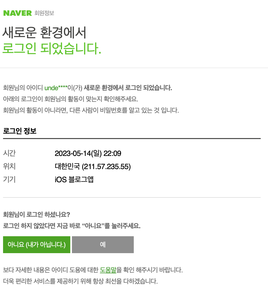아래쪽으로 내려오면 '아니요(내가 아닙니다)' 글자도 자간이 안맞아가지고 글자가 좁게 표현되어 있는걸 볼 수 있습니다. 이런 부분들은 바로 눈에 띄는 부분들이라서 피싱 메일인지 체크하는데 도움을 주는 요소가 될걸로 생각합니다.