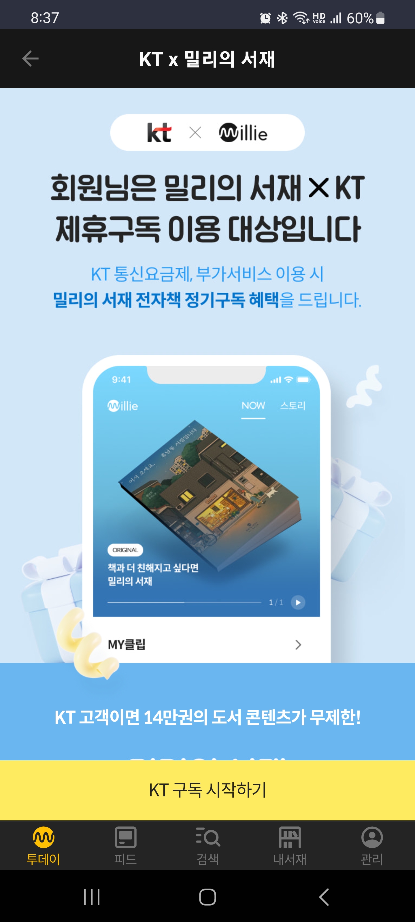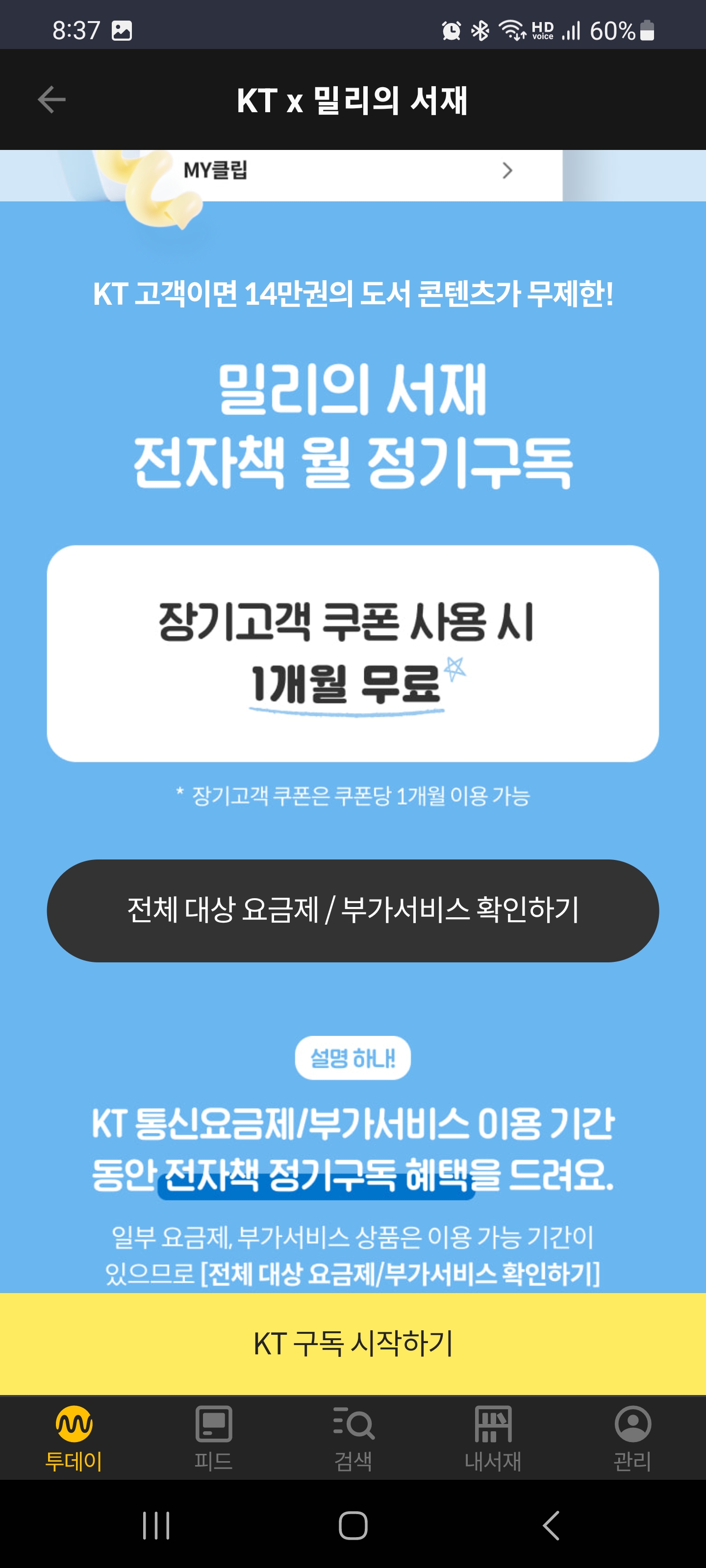 KT 장기이용혜택 쿠폰으로 밀리의 서재 등록하기