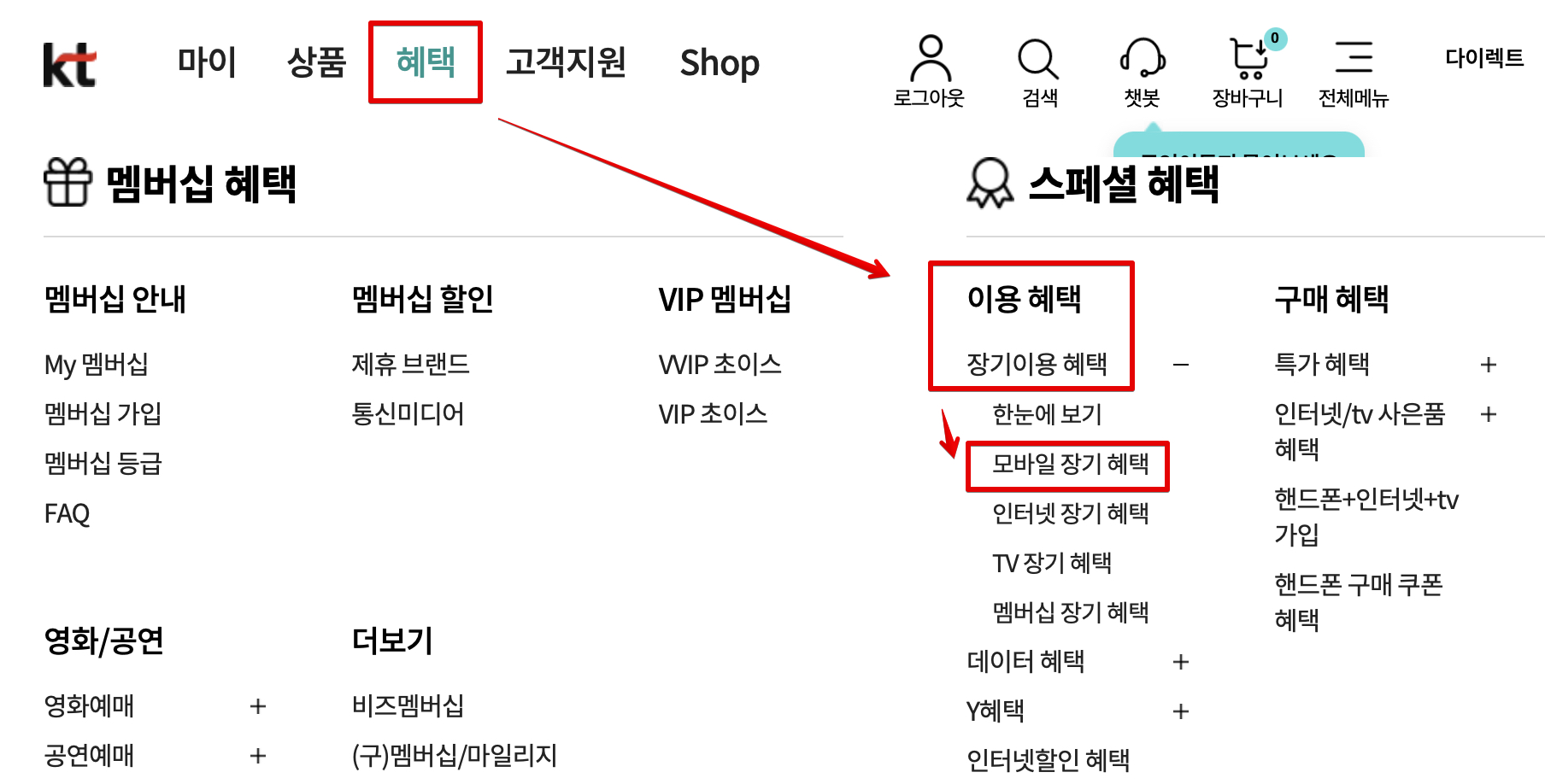 KT 홈페이지에서 로그인을 해주시고요. 상단 메뉴에서 [혜택]으로 들어간 다음 [이용 혜택]으로 들어가서 [장기이용 혜택]을 열게 되면 [모바일 장기 혜택]이라는 항목이 나오는데 여기에서 내용을 상세하게 확인할 수 있습니다.