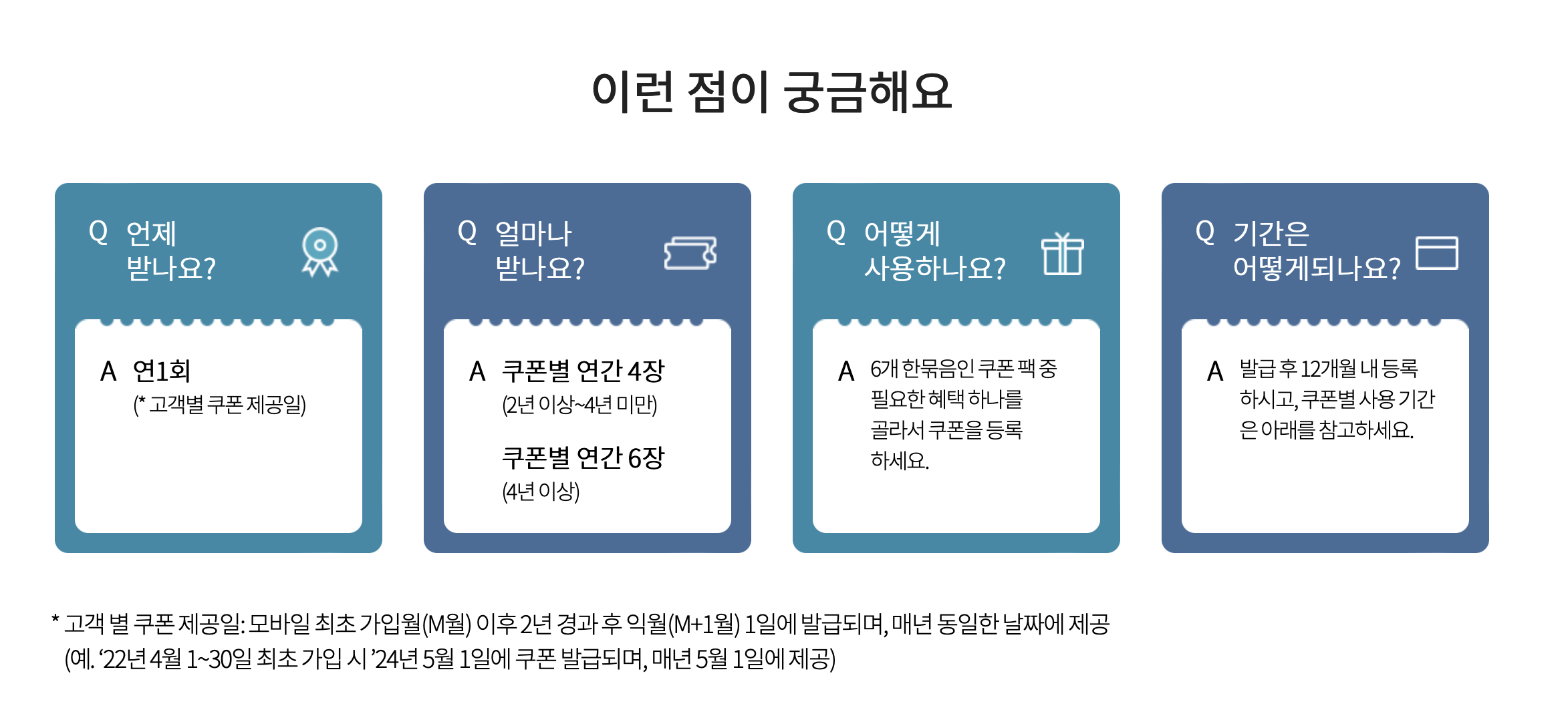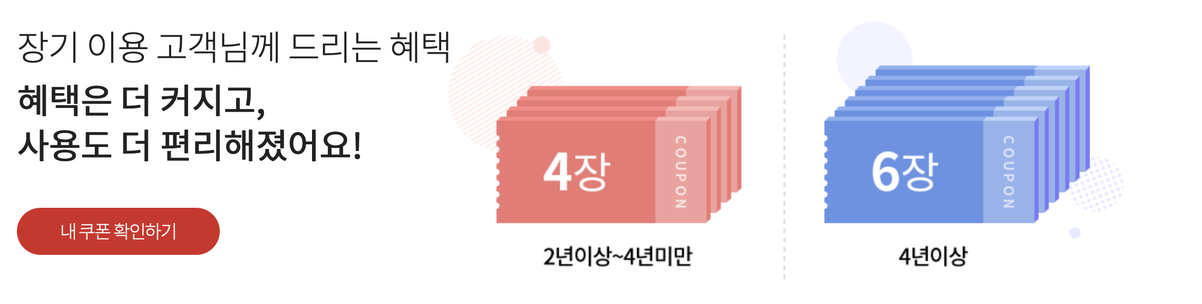 이용기간에도 차등을 두고 있는데요. 2년 이상~4년 미만 사용자에게는 1년에 4장을 준다고 하고요. 4년 이상 고객에게는 6장을 줍니다. 저는 6년이 훨씬 넘은 상태라서 6장을 받게 되었습니다.