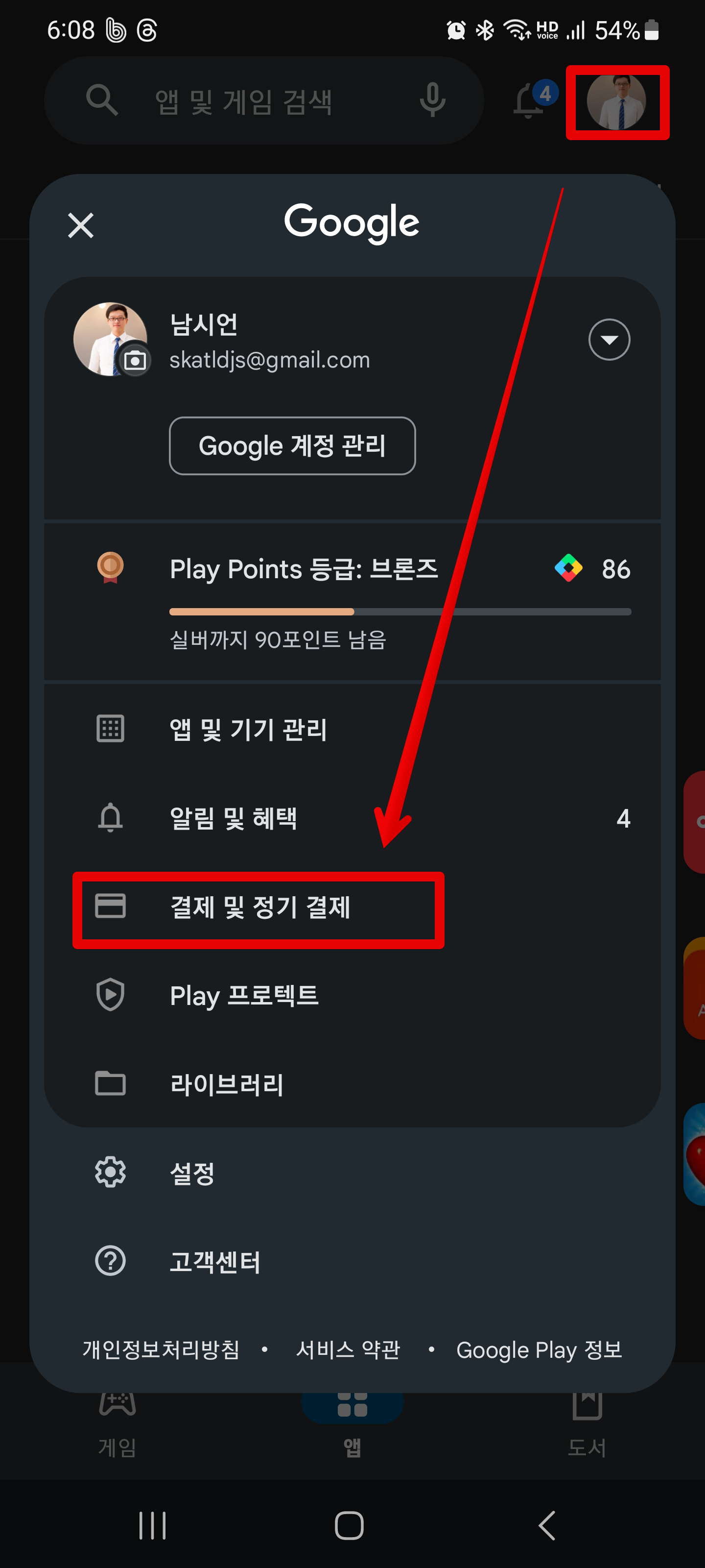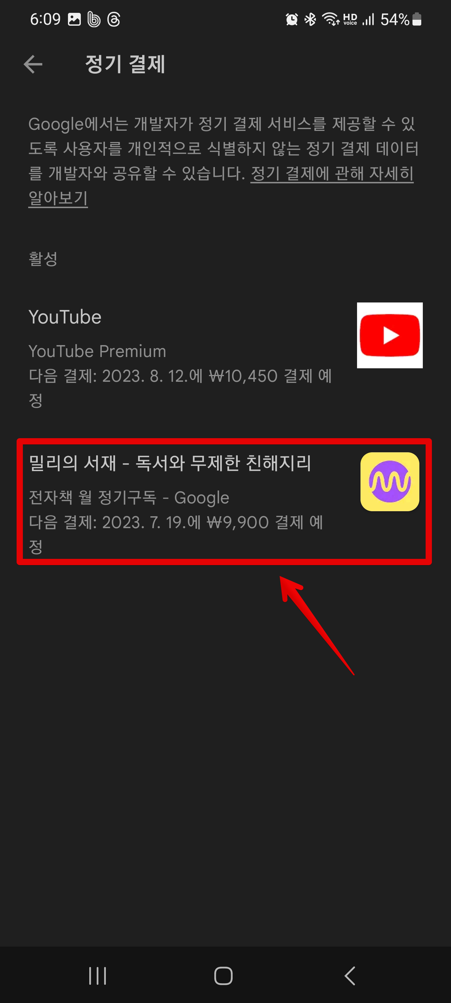 먼저 구글 플레이스토어로 들어가줍니다. 여기에서 우측 상단에 있는 프로필을 클릭한 다음 [결제 및 정기 결제]를 클릭하고요. 여기에서 다시 [정기 결제]를 클릭합니다. 이렇게하면 지금 나의 정기결제 항목을 볼 수 있는데요. 저의 경우에는 현재 유튜브 프리미엄과 밀리의서재 2개를 구독하고 있는 상태입니다. 여기에서 해지하고 싶은 항목, 그러니까 밀리의 서재를 클릭을 해줍니다.