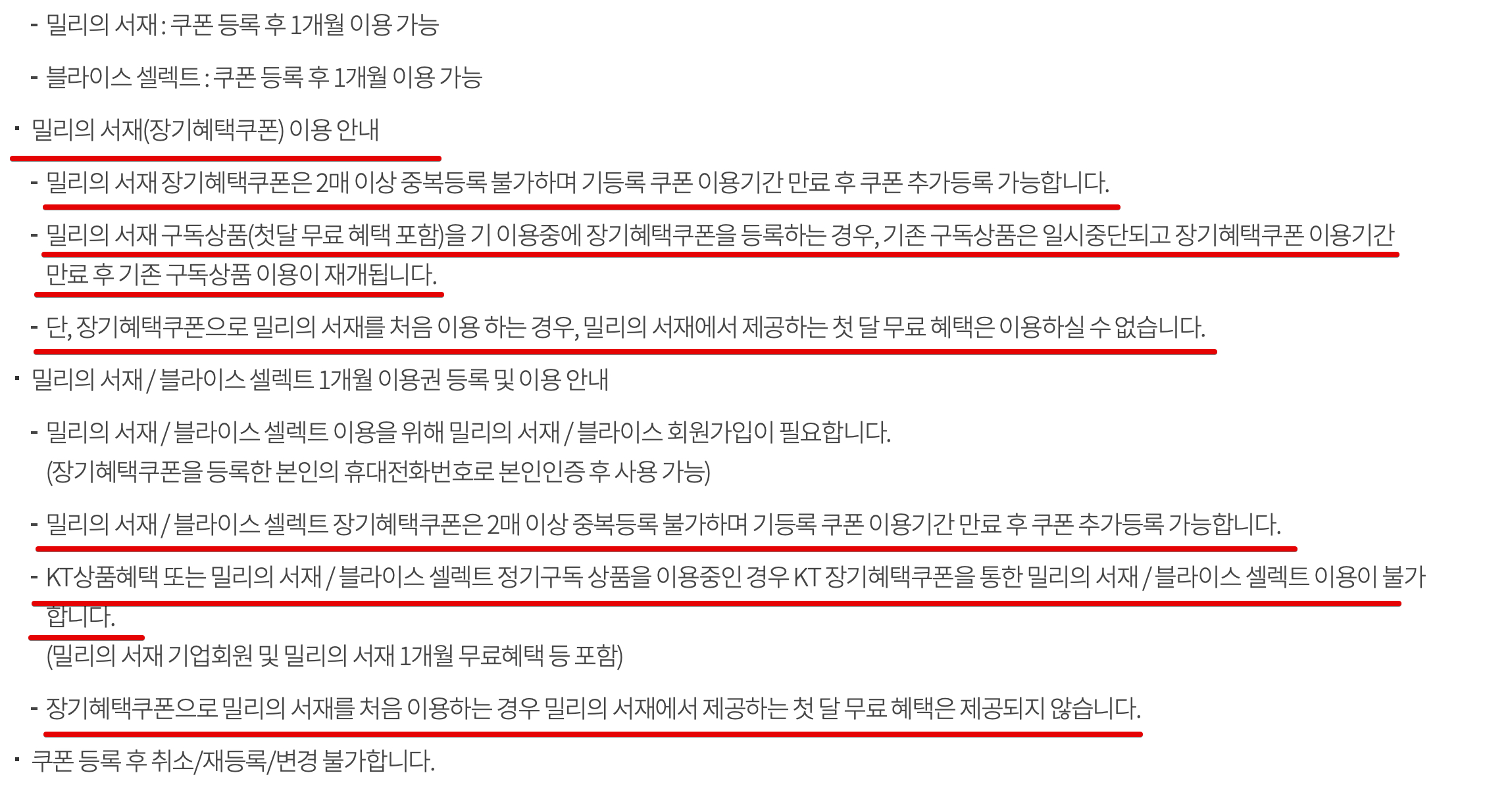 아래쪽에 자세히 보시면 유의사항이 나와있는데요. 여기에서 밀리의서재 관련된 부분만 가져와서 살펴보려고 합니다.