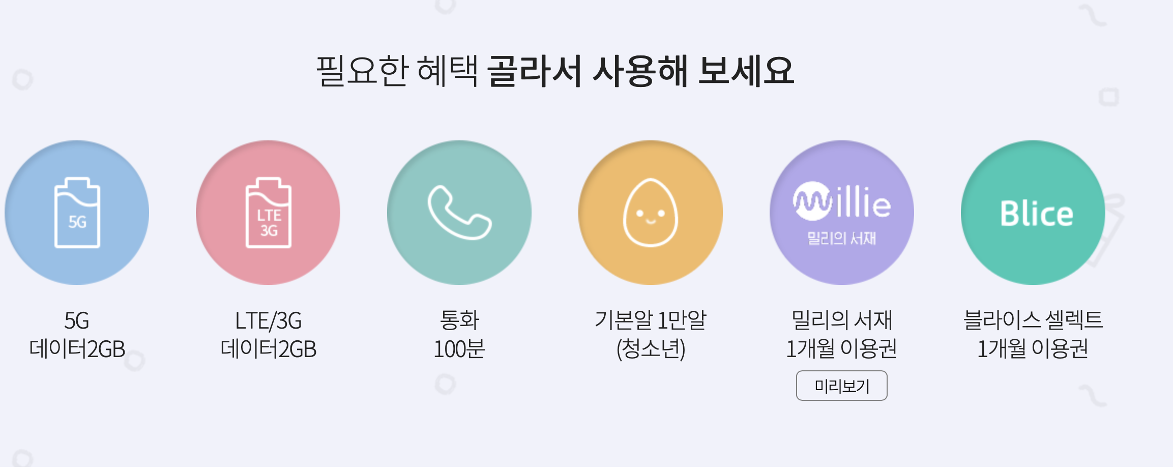 아래쪽에 보시면 장기이용고객에게 주는 혜택이 어떤것인지 나와있는데요. 데이터 2GB 충전부터 시작해서 통화 100분 충전이 있고요. 청소년 요금제에서는 알 1만개를 주는게 있고, 여기에 밀리의서재 1개월 이용권과 블라이스 셀렉트 1개월 이용권이 있습니다.