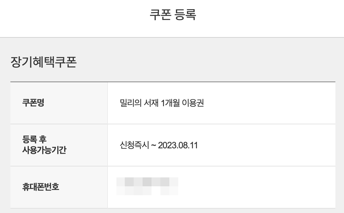 이렇게하면 장기혜택쿠폰이 등록된다고 안내창이 나오는데요. 여기에서 등록 후 사용가능기간 확인할 수 있습니다. 저는 지금 시점(12일)기준으로는 아직 밀리의서재 유료 구독 기간이 남아있어서 유료기간 만료 후에 바로 등록을 할 예정입니다. 유료 구독 중이 아닌 경우에는 여기에서 바로 등록해서 사용하시면 됩니다.