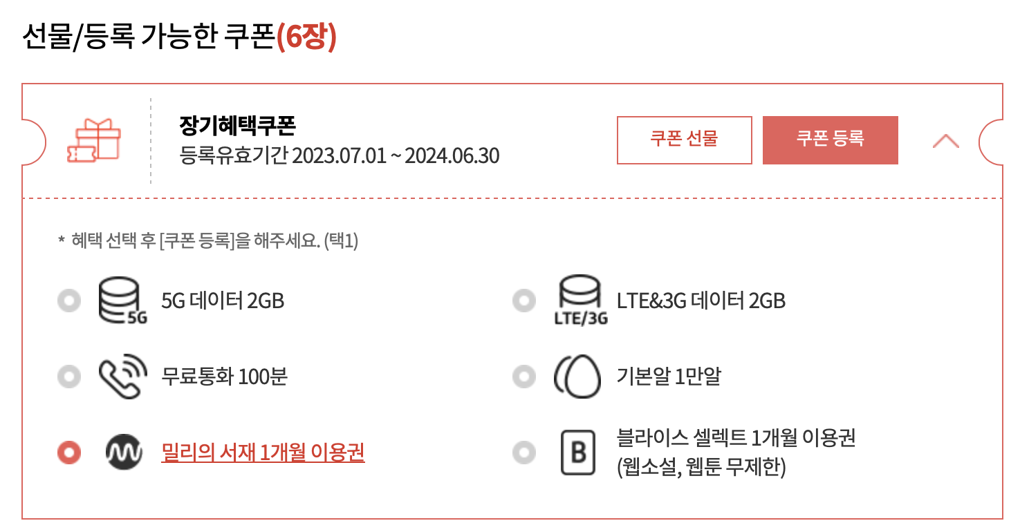 장기혜택쿠폰 창으로 들어가게 되면 위 이미지 같은 화면이 나옵니다. 여기에서 장기혜택쿠폰 6장이 들어와있는 모습 볼 수 있고요. 여기를 클릭하게 되면,