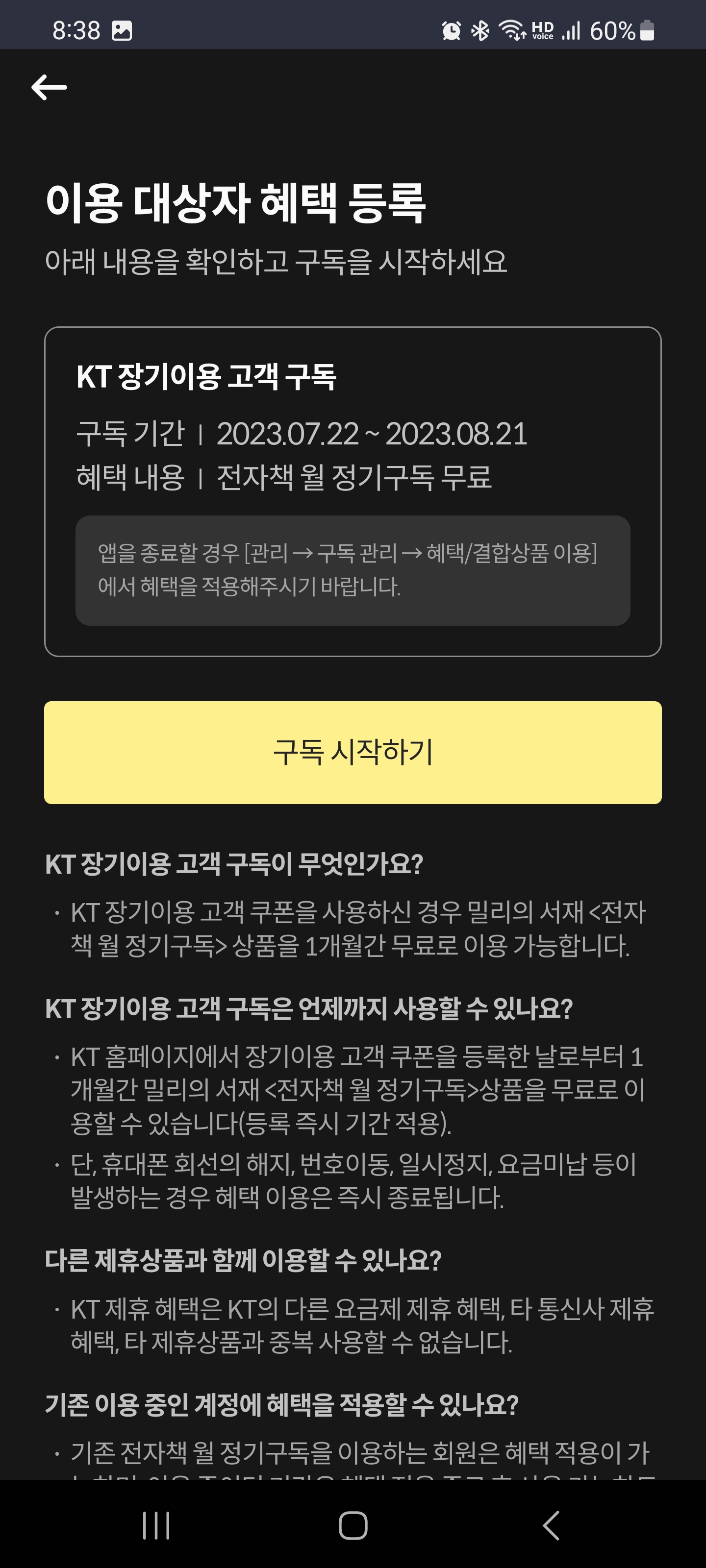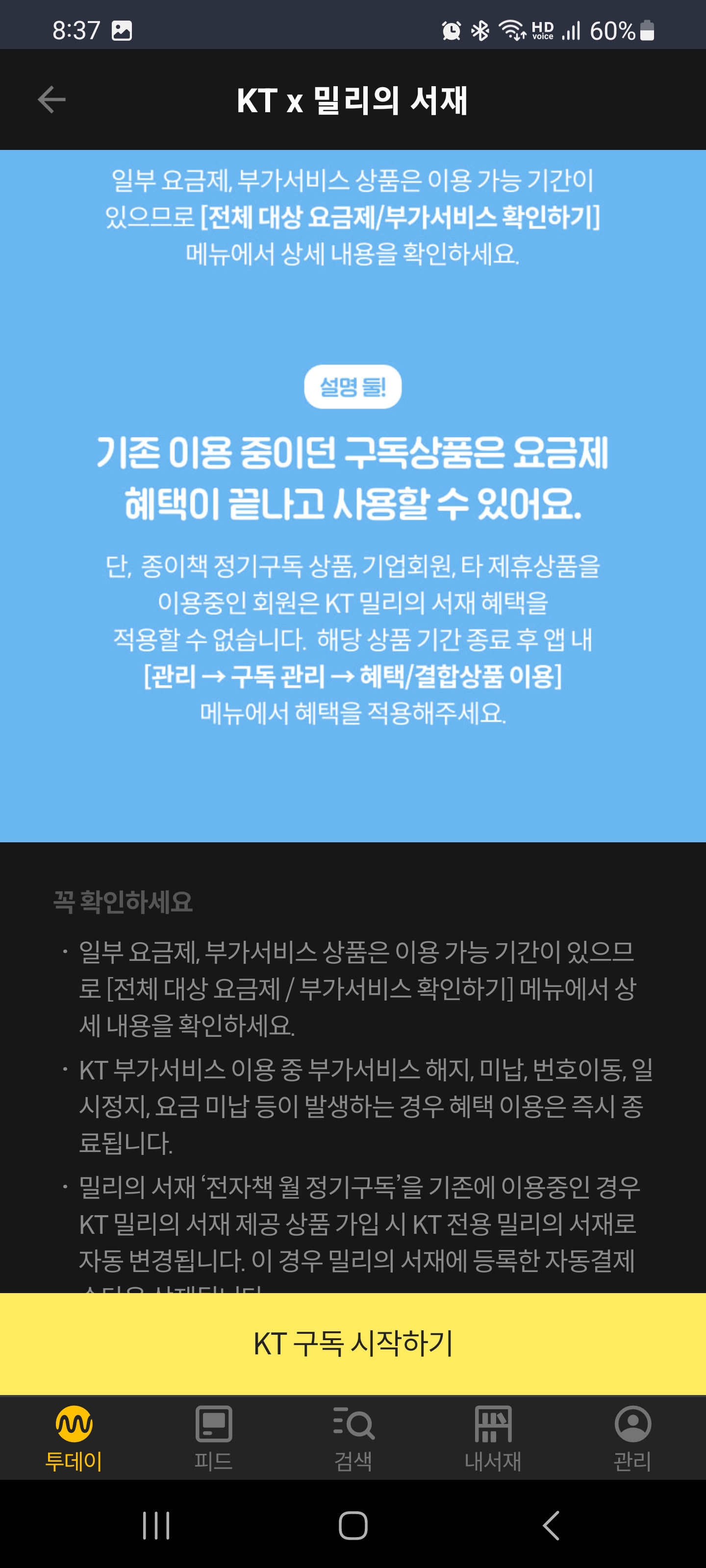 기존 구독기간이 만료되어 이번에 밀리의서재 전자책 월 정기구독 KT 제휴구독 이용으로 다시 구독 신청하였습니다. 그리고 지금 이용 중입니다. 기존 혜택 상품이 구독 완료되고 나서 등록이 가능합니다.