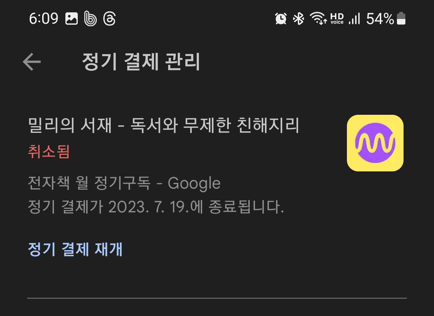 밀리의서재 구독 해지는 컴퓨터에서도 가능하고 스마트폰에서도 가능한데요. 예를들어 저처럼 구글플레이스토어에서 결제가 되는 경우에는 PC에서는 해지가 안되며 스마트폰에 있는 구글 플레이스토어 앱에서만 해지가 가능합니다.