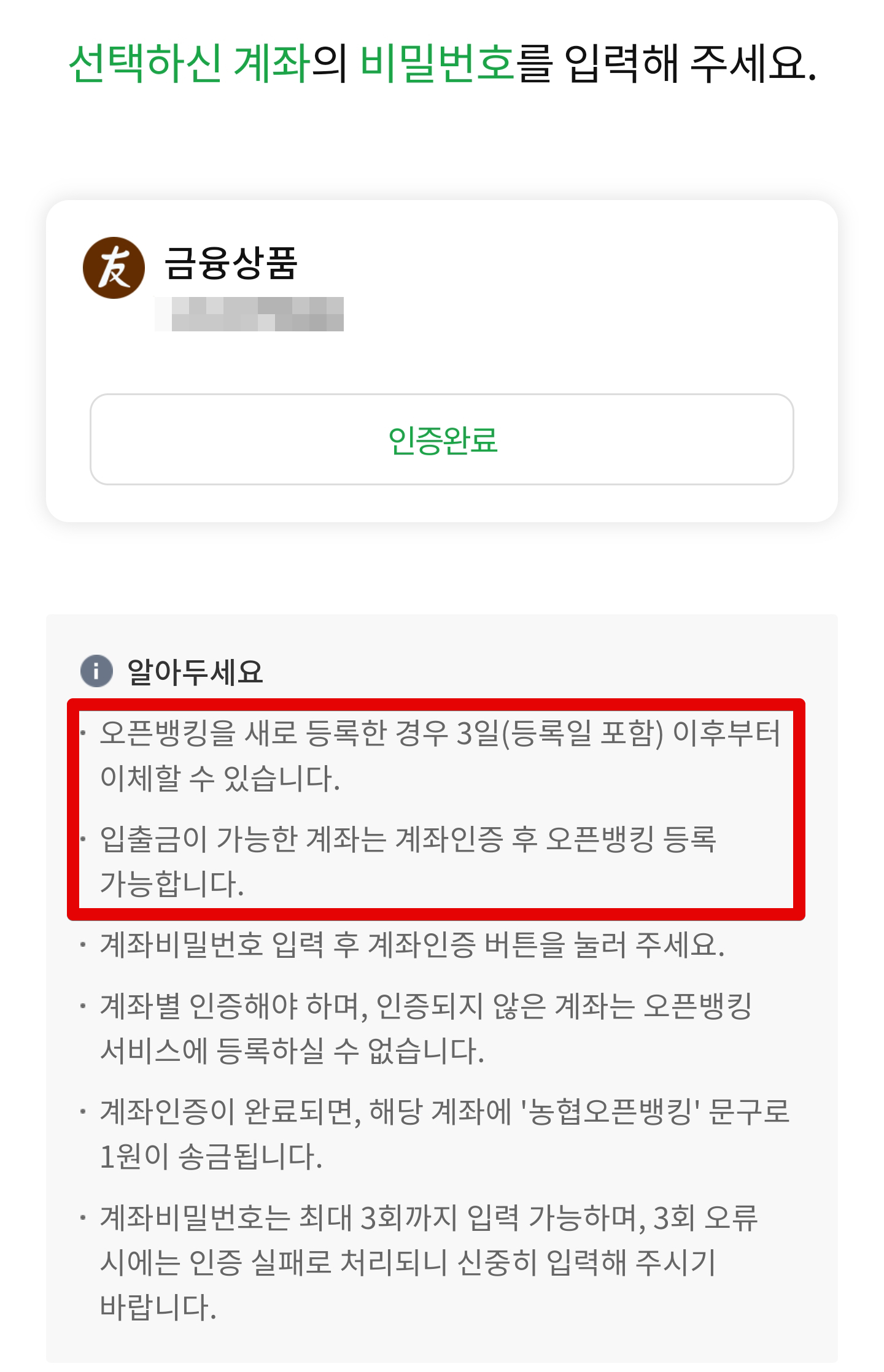 그 다음 비밀번호 등을 입력해서 등록을 완료해주는데요. 아래쪽에 설명에 보면 오픈뱅킹을 새로 등록한 경우에는 3일 이후부터 이체가 가능하다고하며, 입출금이 가능한 계좌는 계좌인증 후에 오픈뱅킹 등록을 해야한다고 돼 있습니다.