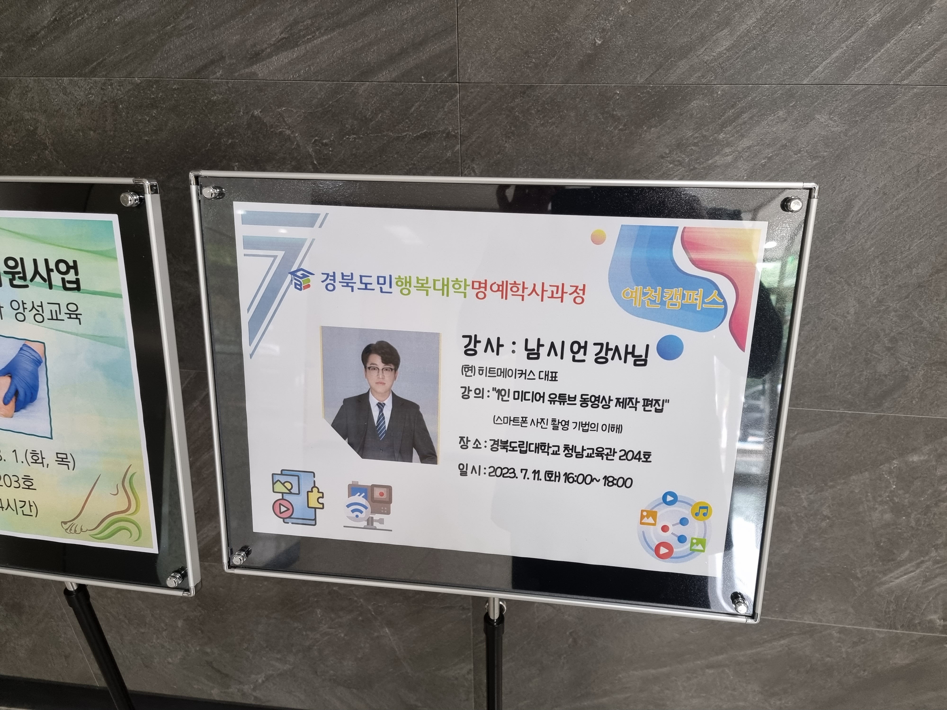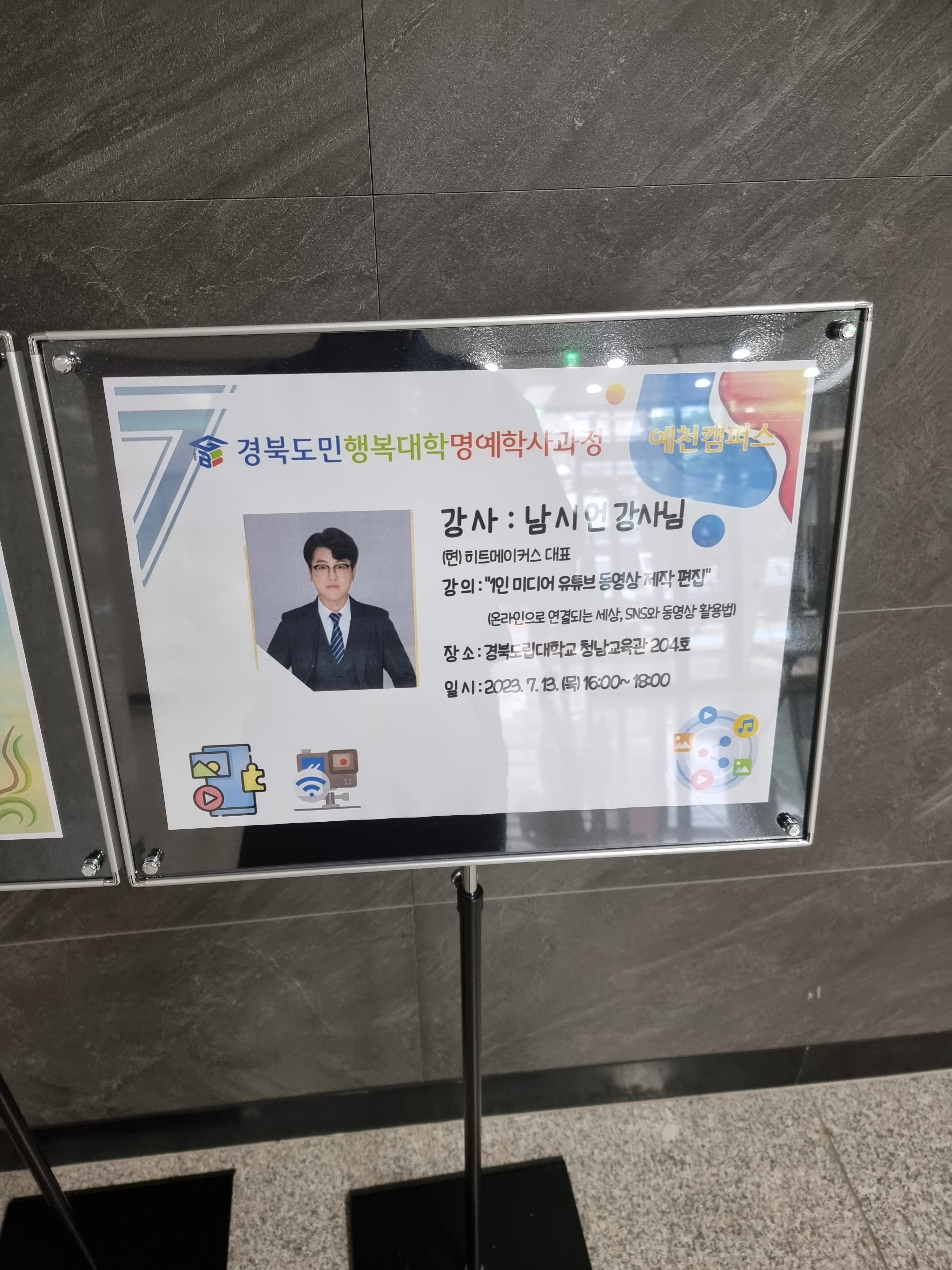 2023년 경북도민행복대학 명예학사과정에서 여름방학 특강 프로그램의 일환으로 "1인미디어 사진 동영상 제작 편집"강의를 진행하였습니다. 경북도립대학에서 오후 시간대에 진행이 되었는데 경북도민행복대학 명예학사과정에서 참여해주신분들이 참석률이 좋고, 강의에 너무 열정적으로 참여해주셔서 정말 재미있는 강의 시간이 되었습니다.