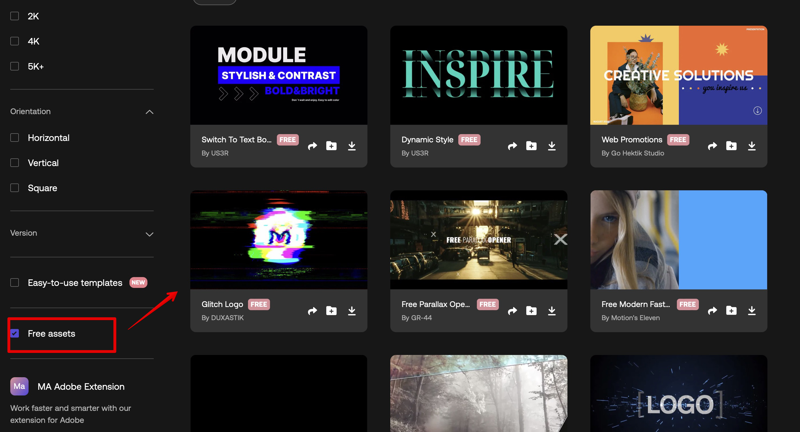 왼쪽 정렬 메뉴에서 아래쪽으로 내리시면 [Free assets]이라는 항목이 있습니다. 이 항목을 체크하시면 무료로 쓸 수 있는 애프터이펙트 자막 템플릿을 별도로 따로 떼어내서 살펴볼 수 있습니다. 무료 템플릿들 중 몇 개를 미리 사용해보고 구매를 결정해도 좋겠습니다.