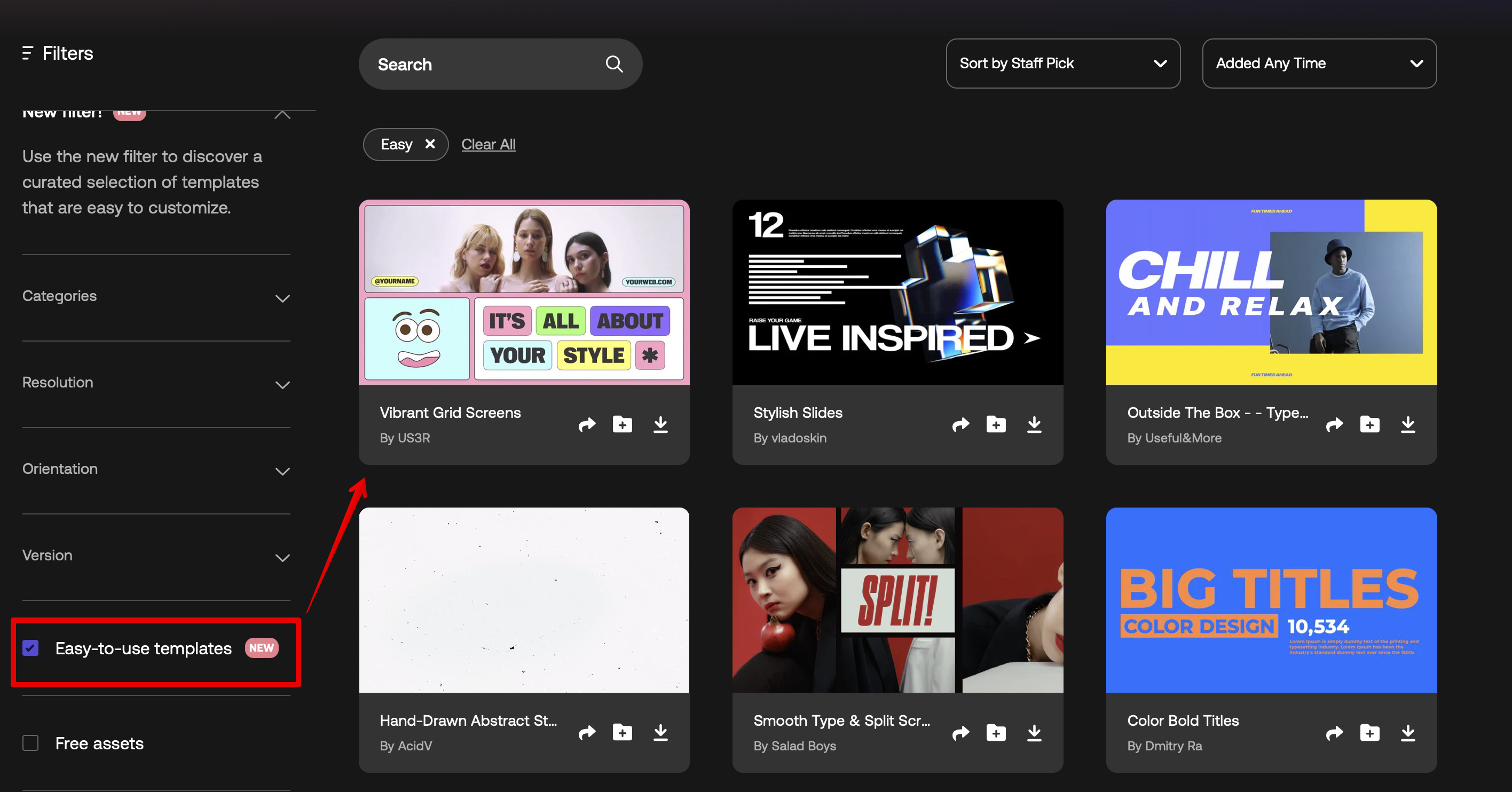 왼쪽 메뉴에서 [Easy-to-use templates]를 선택해보세요. 이지투유즈 템플릿은 사용법이 가장 쉬운 템플릿들이 엄선되어 있는 항목이며 애프터이펙트 초보자분들에게 가장 추천하는 방식입니다. 이 곳에 있는 템플릿들은 사용법이 매우 쉬우며 별다른 설정이나 기타 사용자 정의가 없어도 다운로드 후 바로 사용할 수도 있을 정도의 난이도이므로, 편하게 쓸 수 있다는 장점이 있습니다.