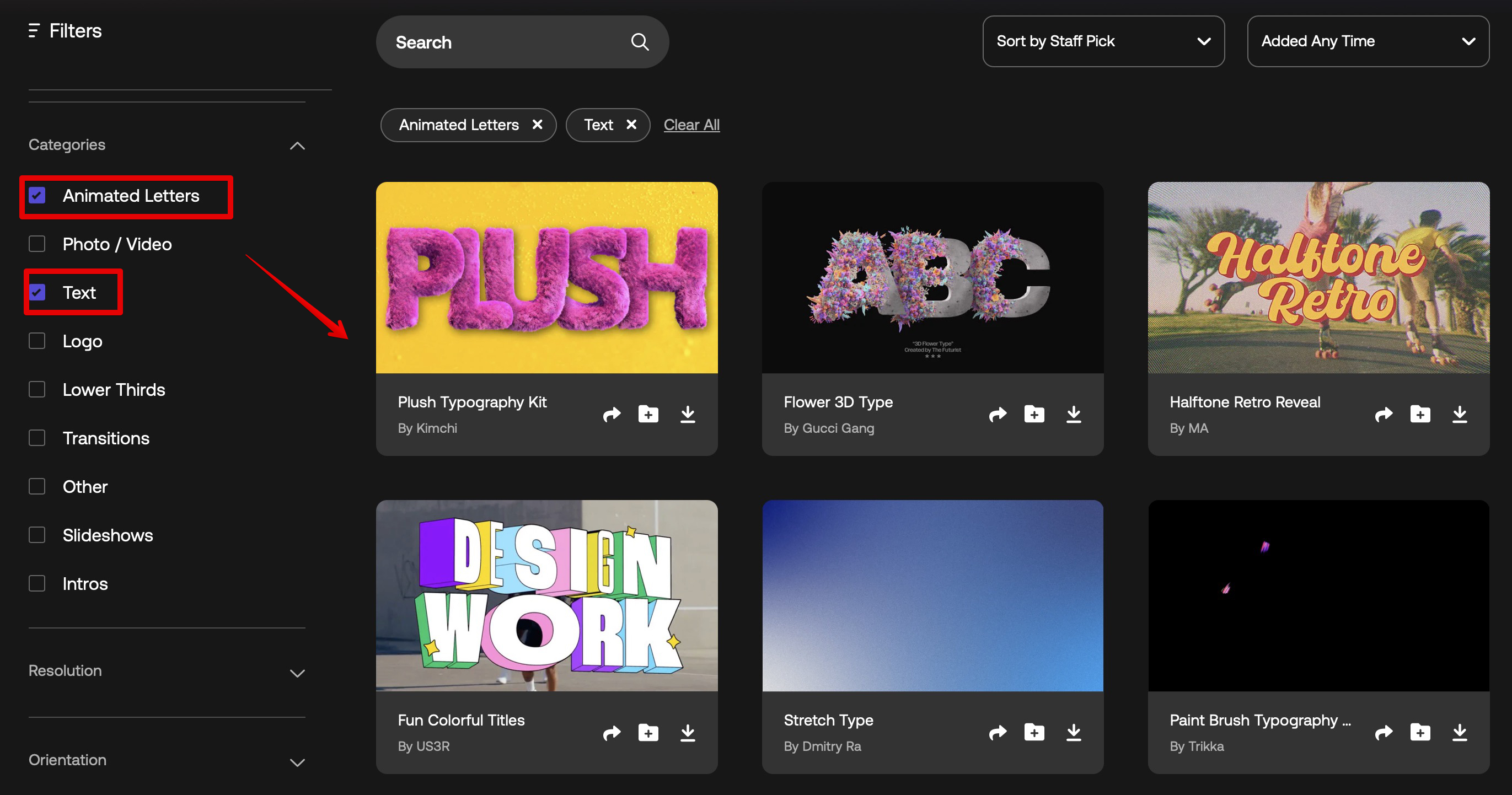 여기에서 꿀팁을 드리자면, 왼쪽 카테고리 정렬에서 [Animated letters]와 [Text]를 함께 선택해서 정렬을 한 다음 자막 디자인 템플릿을 찾아보세요. 이렇게하면 요즘 인기있고 많이 쓰이는 재미있고 유용한 자막 템플릿들과 특히 3D 애니메이션이 가능한 자막 템플릿을 골라내는게 더 쉬워집니다.