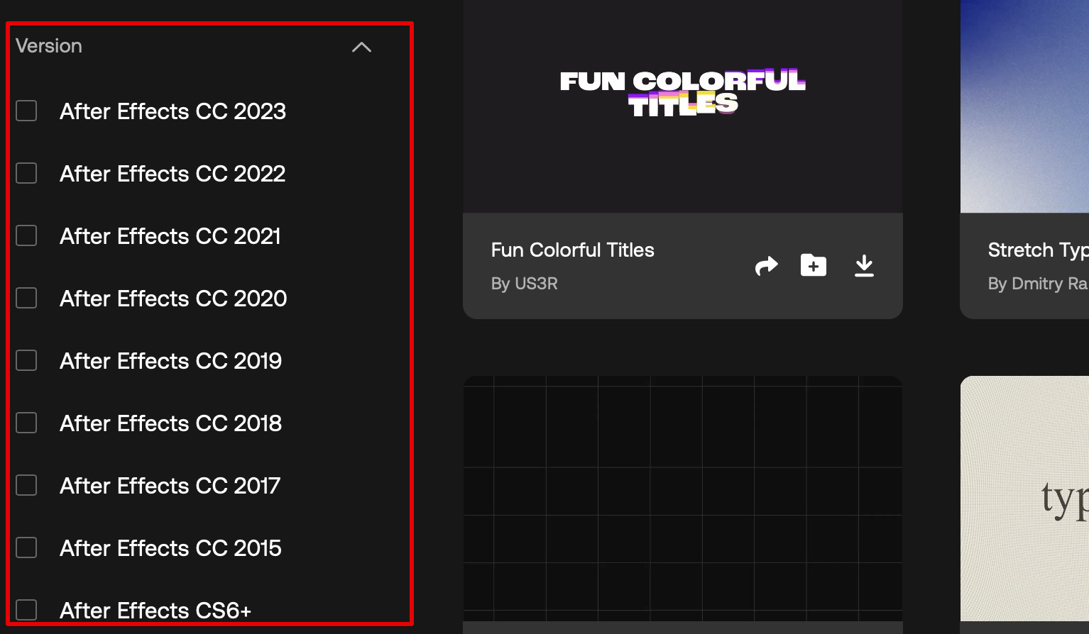 왼쪽 카테고리에서 사용하고 있는 애프터이펙트 버전에 맞는 템플릿을 별도로 정렬할 수도 있습니다. 가능하면 최신 버전을 쓰시면 제일 좋은데, 불가피하게 최신 버전을 사용할 수 없다면 자신이 사용하고 있는 버전에 딱 맞는 템플릿들만 골라서 활용해보는 것도 좋겠습니다.