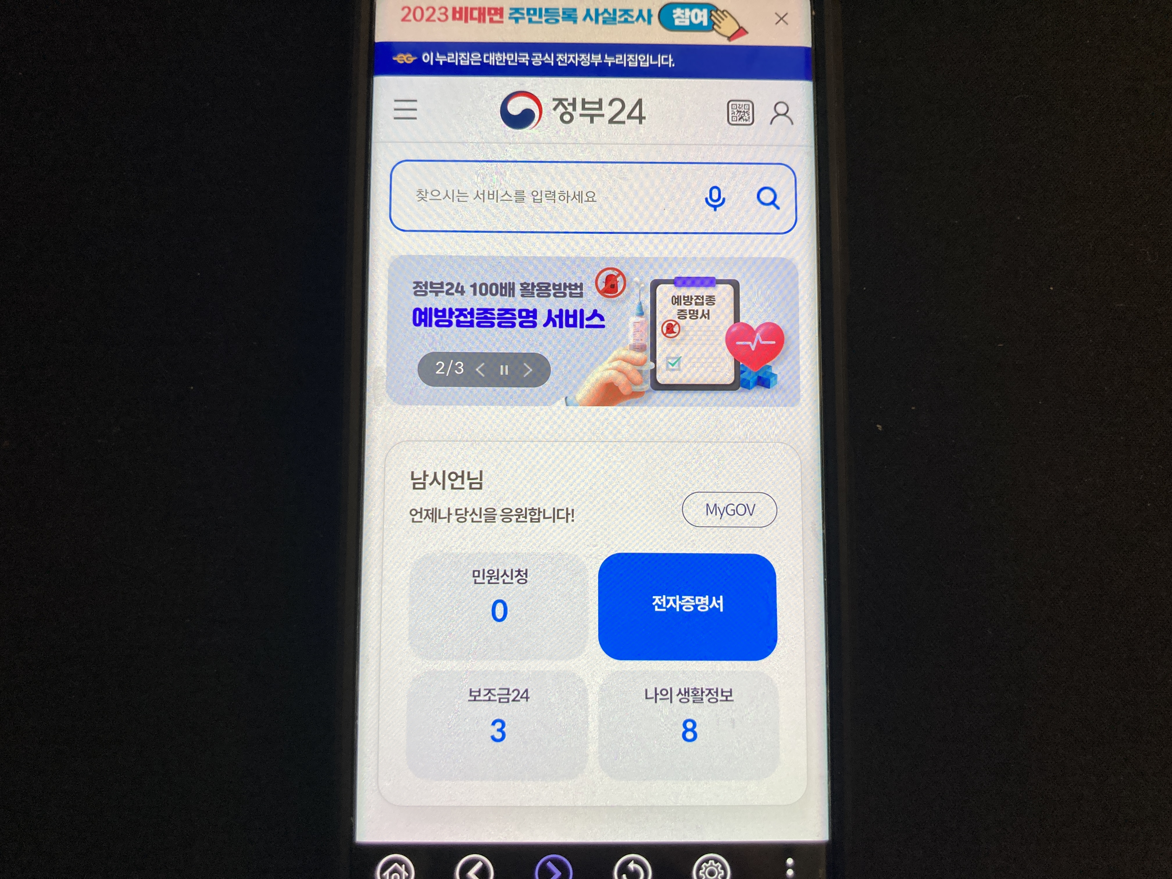 2023 주민등록 사실조사 비대면으로 참여할 땐 스마트폰을 이용해 정부24 앱을 설치하고 정부 24 앱에서 진행을 하면 됩니다.