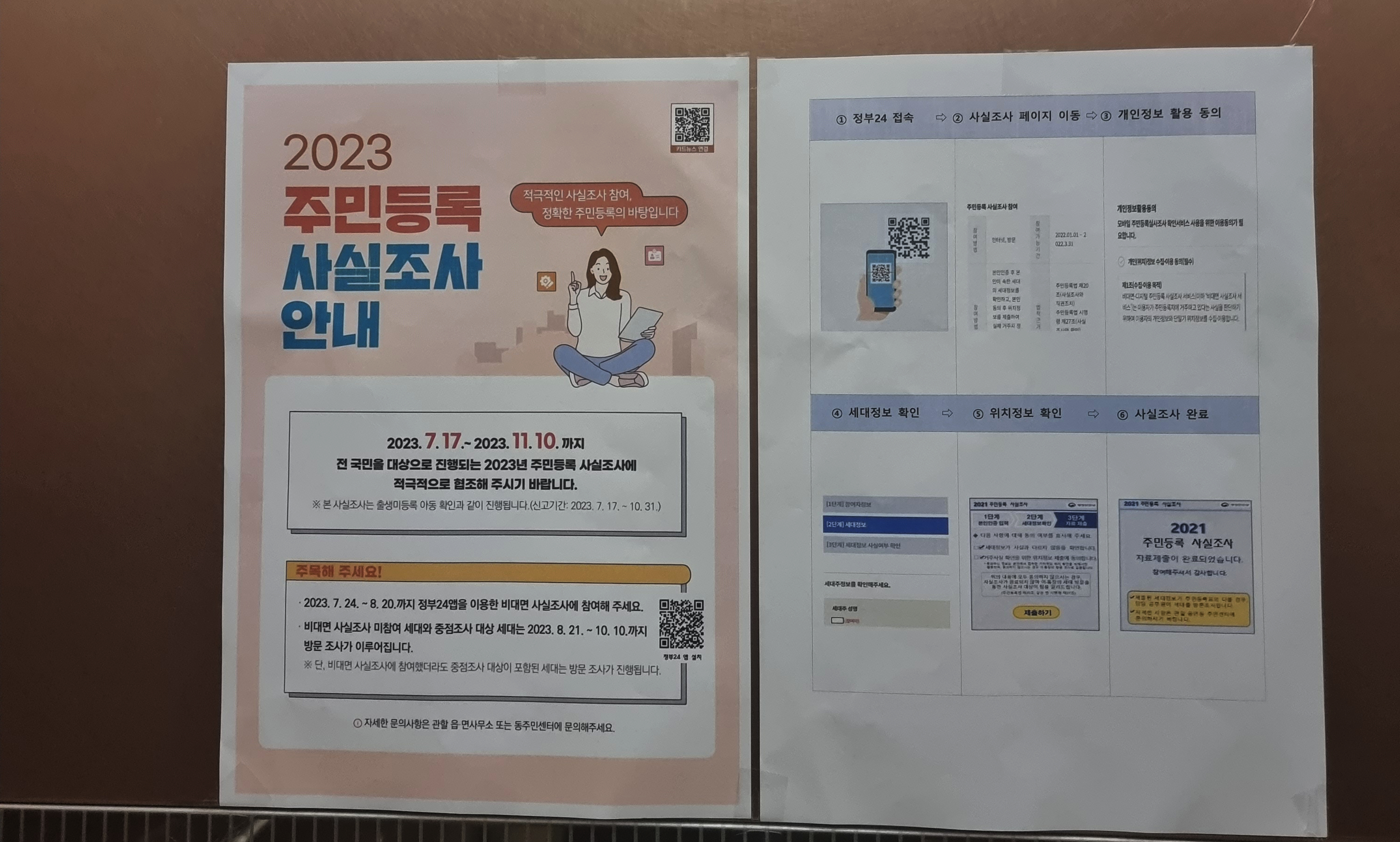 2023년 주민등록 사실조사 안내가 있습니다. 전국민 모두가 참여해야하므로 저도 이번에 정부24 앱을 통해 사실조사에 참여했는데요. 어제 살고있는 곳 엘리베이터에 타니까 위 사진과 같은 안내문이 붙어있더라고요. 2023년 7월 17일부터 2023년 11월 10일까지 주민등록 사실조사가 이뤄지며, 비대면 사실조사에 참여할 경우 7월 24일부터 8월 20일까지 진행을 해야한다고 합니다. 그 이후부터는 대면조사가 이뤄진다고 하는데, 대면 조사를 받기가 좀 꺼려져서 비대면으로 미리 참여했습니다.