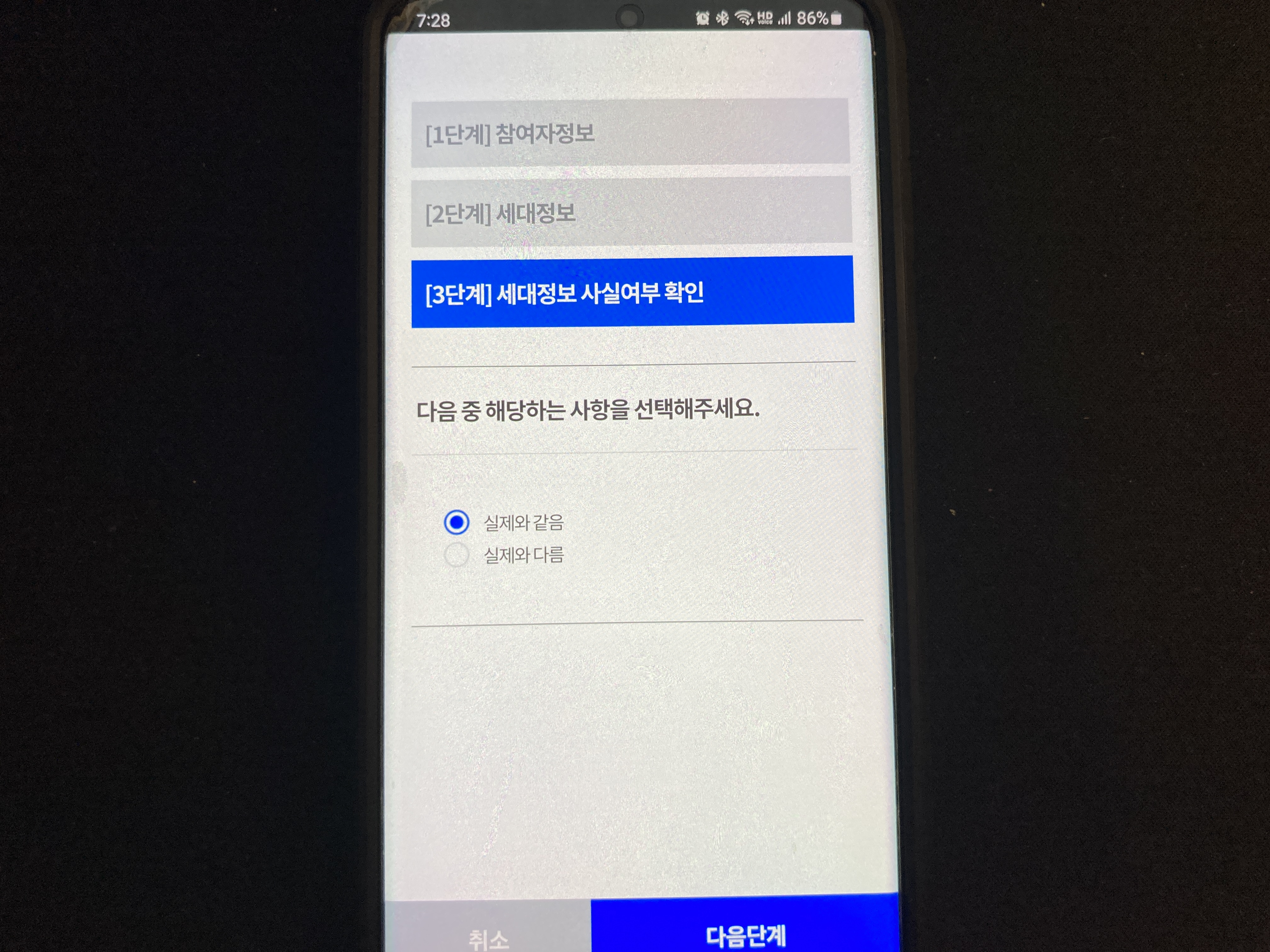 참여자 정보와 세대정보가 나타나는데 실제와 맞는지 체크하시고 마지막에 실제와 같음에서 다음 단계로 넘어가줍니다.