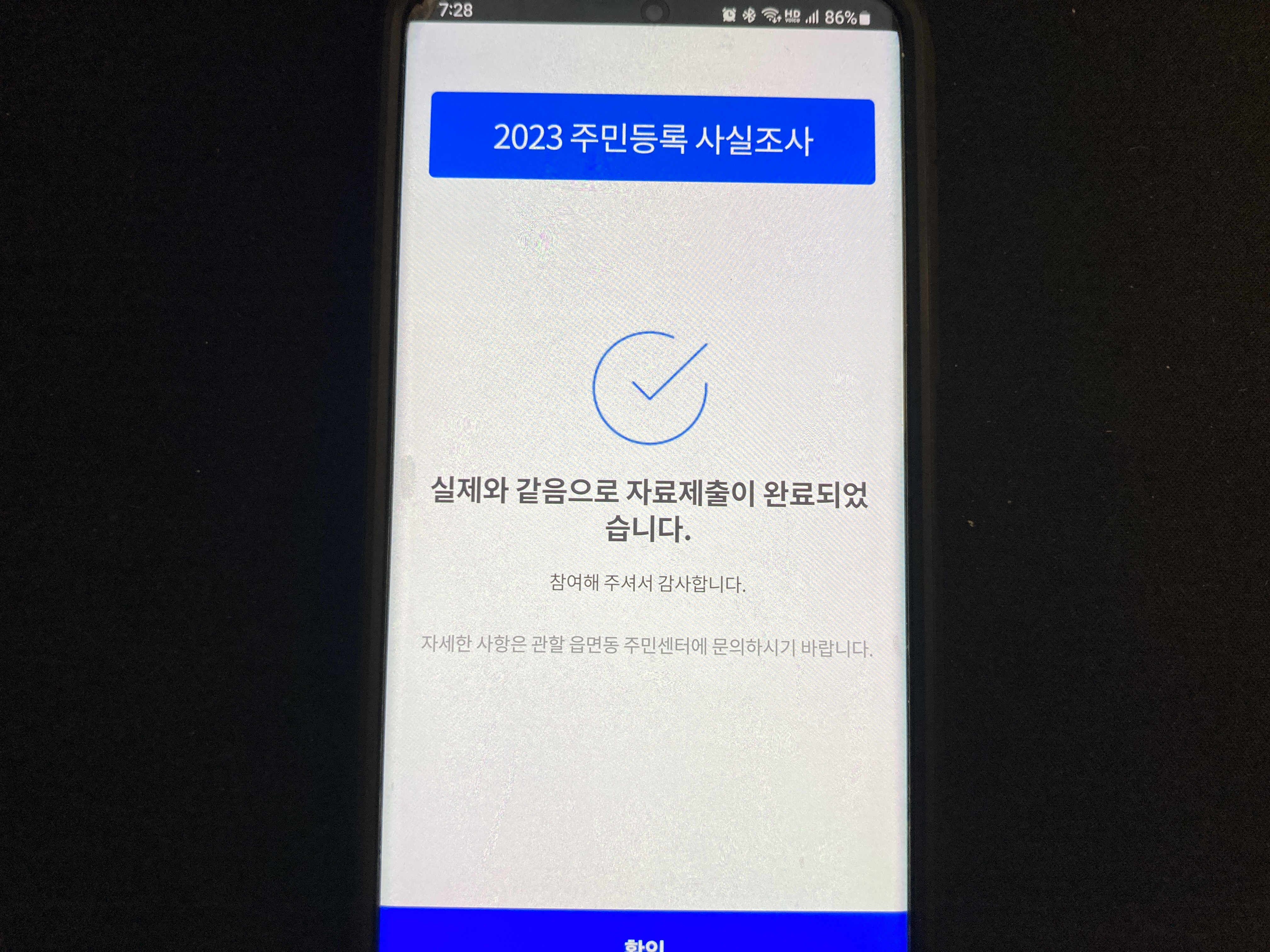 마지막으로 정보를 확인한 후 자료 제출을 완료하면 2023 주민등록 사실조사 참여가 완료됩니다.