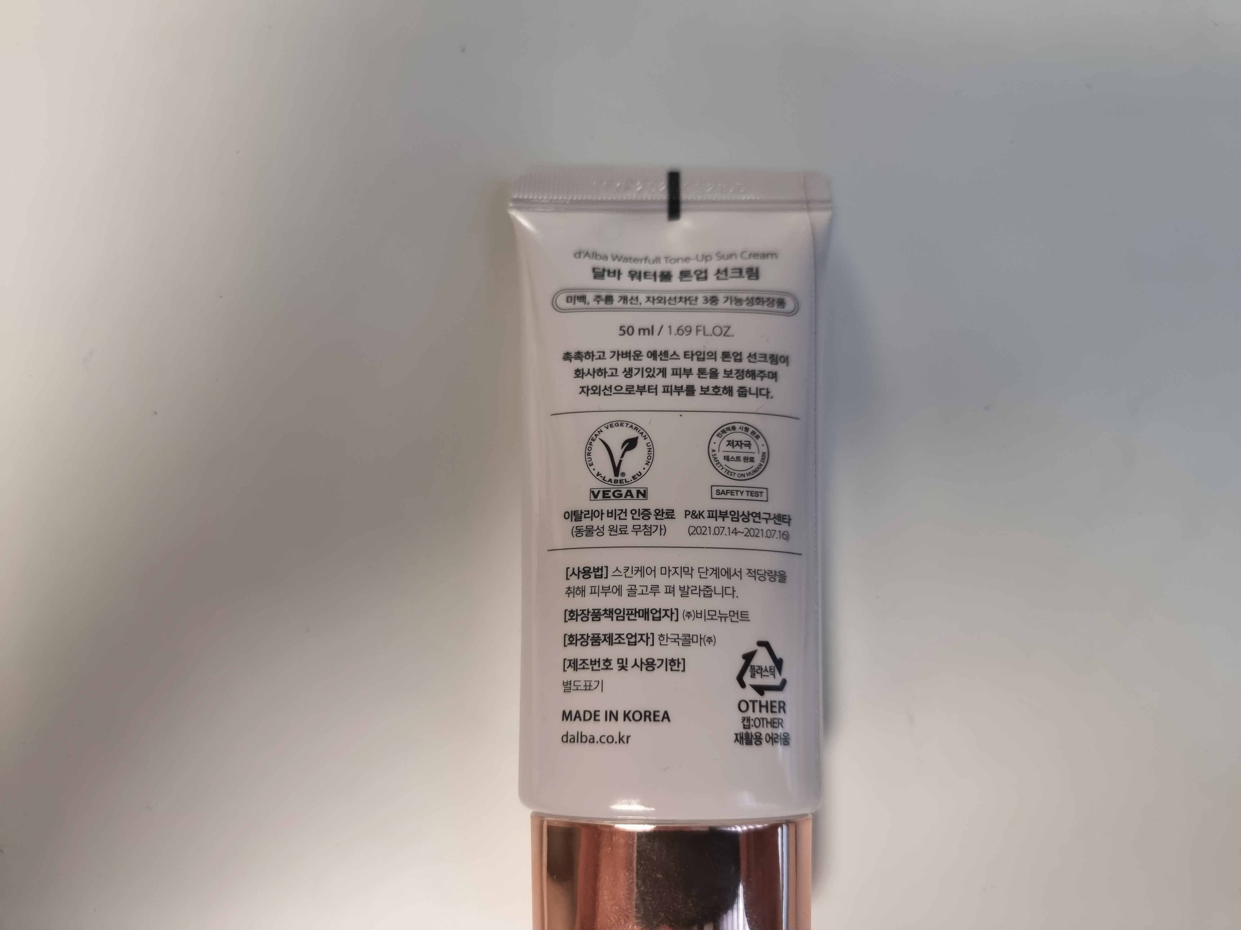 이름이 달바 워터풀 톤업 선크림인데요. 톤업 기능이 있어서 남성분들이 바르기에도 나쁘지 않은것 같아요. 피부가 예민해서 개인적으로는 미백,주름개선 기능이 없는 화장품을 선호하기는 하는데, 어쨌든 이 제품은 부드럽게 잘 발리고 톤업 기능이 있어서 피부톤이 조금 올라가긴 합니다.