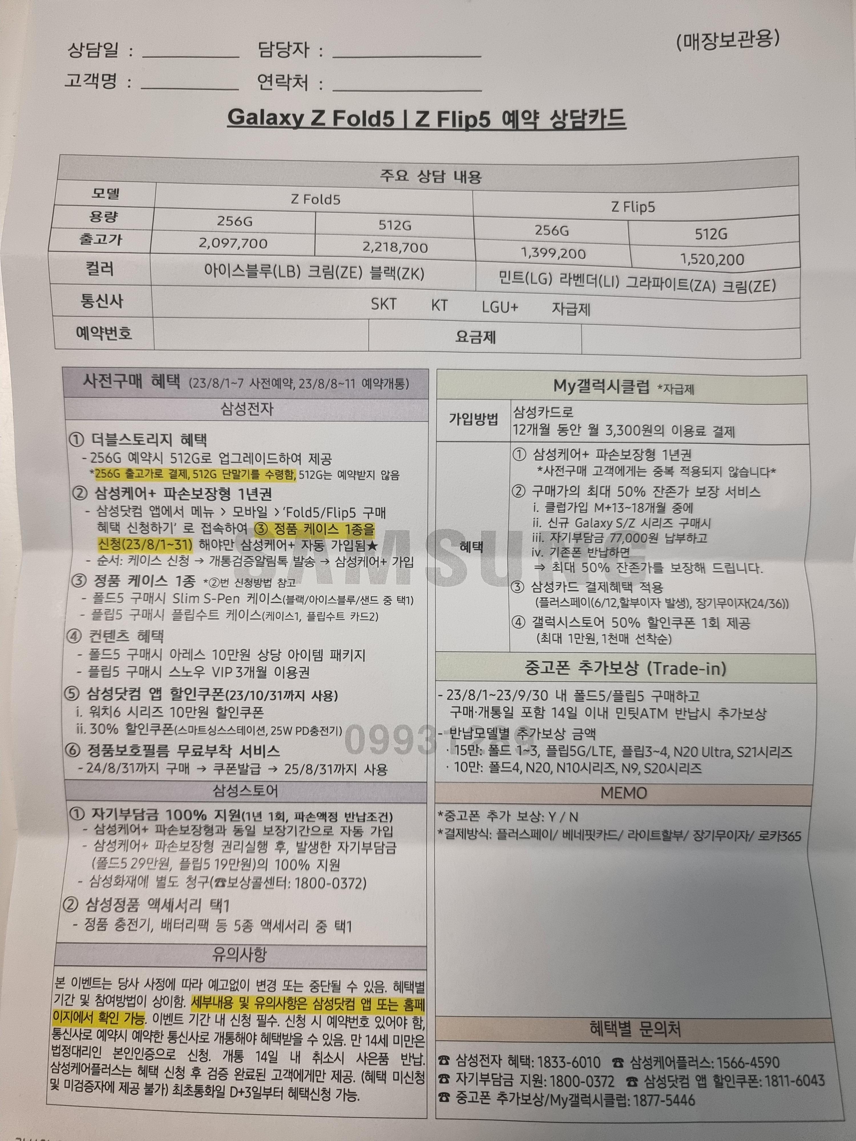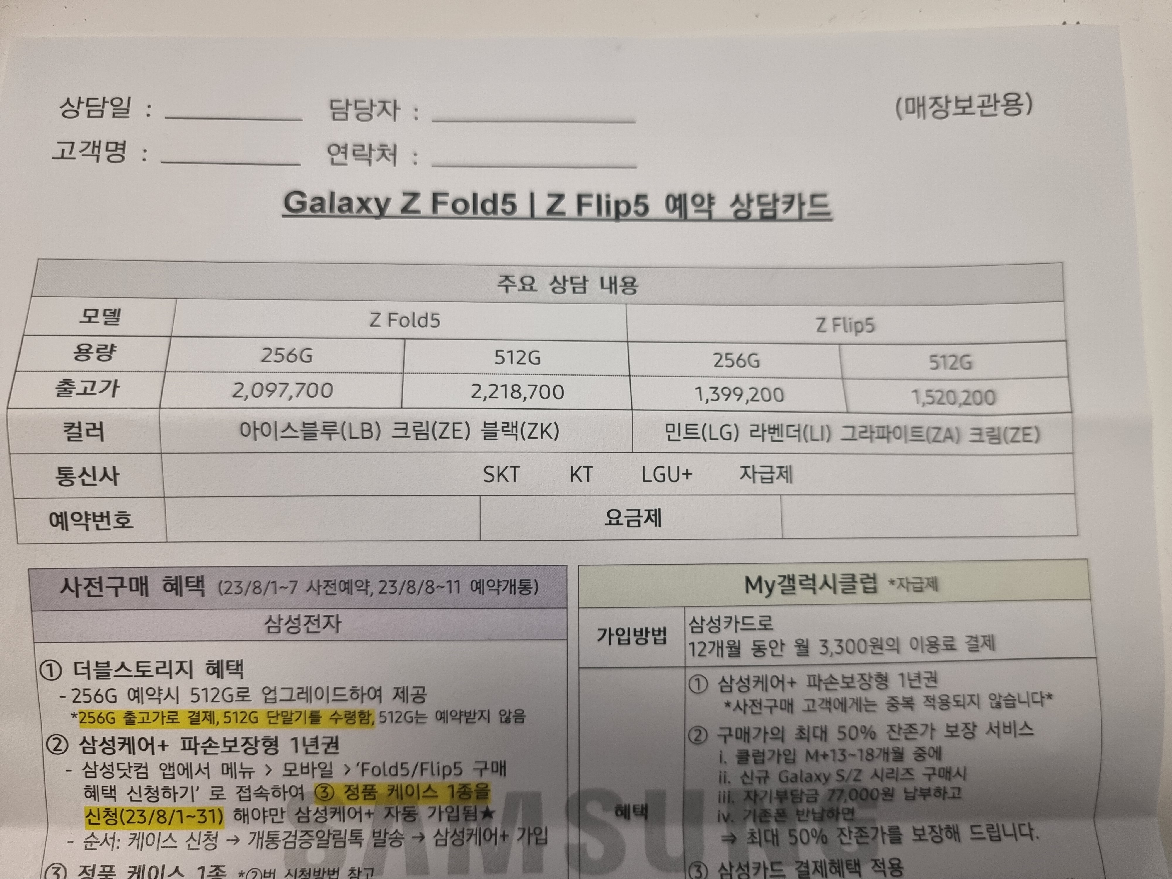 아무튼 이번에 Z플립5가 너무 예쁘게 나와서 지금 쓰고있는 폰을 바꾸기로 결정하고, 며칠동안 고민고민하다가 오늘 삼성스토어에서 사전예약 신청하고 왔습니다!